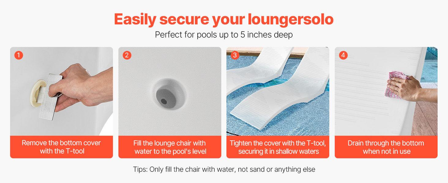 Lehátko v bazéne môžete ľahko naplniť vodou odstránením spodného uzáveru alebo pomocou záhradnej hadice. Po naplnení zostane na mieste. Keď ho nepoužívate, vypustite vodu, aby zostalo suché a čisté, čo pomáha predĺžiť jeho životnosť.