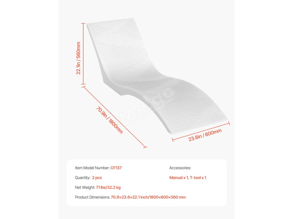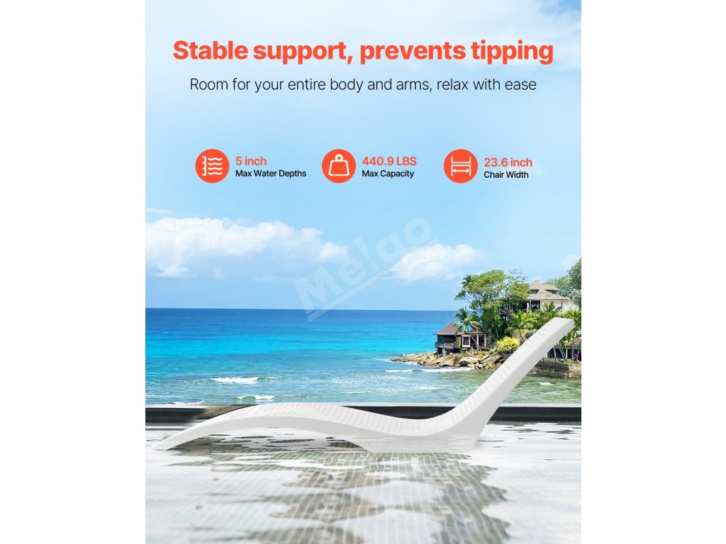 Lehátko do bazéna má ergonomický dizajn v tvare písmena S, ktorý sa prispôsobí chrbtici a zabezpečí dlhotrvajúce pohodlie. So šírkou sedadla 22,8" a nosnosťou 440,9 lbs/200 kg poskytuje dostatok priestoru a lepší zážitok z vody pre všetkých používateľov.