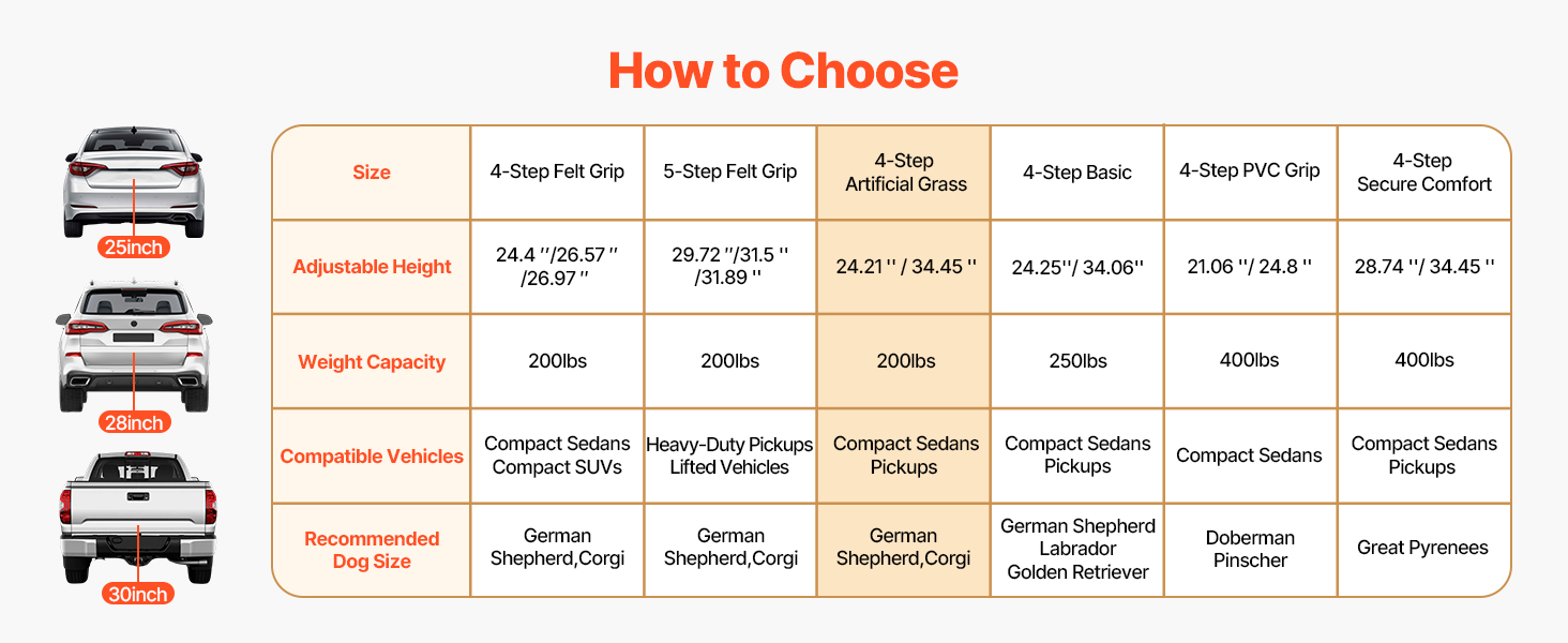 Naše schody do auta pre psov ponúkajú dve nastaviteľné výšky pre flexibilné použitie. Uľahčujú psom rôznych veľkostí pohodlné vyliezanie v rôznych situáciách.