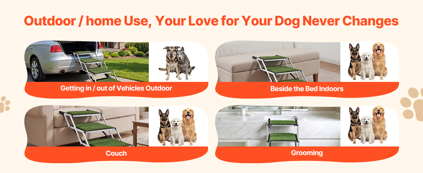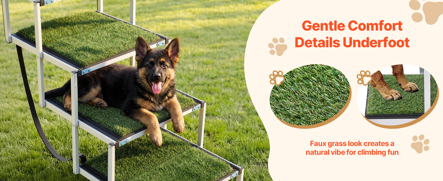 Tieto schody do auta pre veľké psy sú pokryté umelou trávou z PE, ktorá vyzerá a pôsobí prirodzene. Povrch povzbudzuje vášho psa, aby vyliezal s istotou a pohodlím.