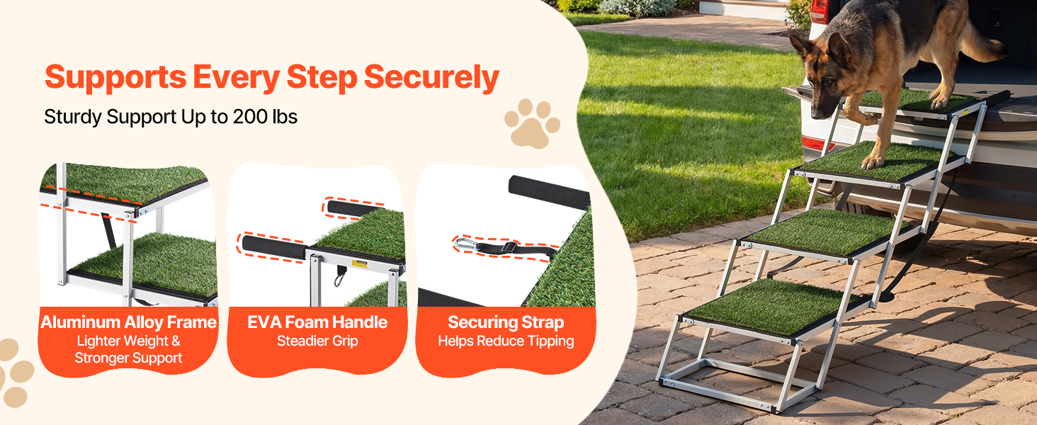 Tieto schody do auta pre psov sú vyrobené zo zosilneného kovového rámu a poskytujú spoľahlivú stabilitu. Bezpečné upevnenie pomáha udržať vášho psa stabilného pri každom kroku.