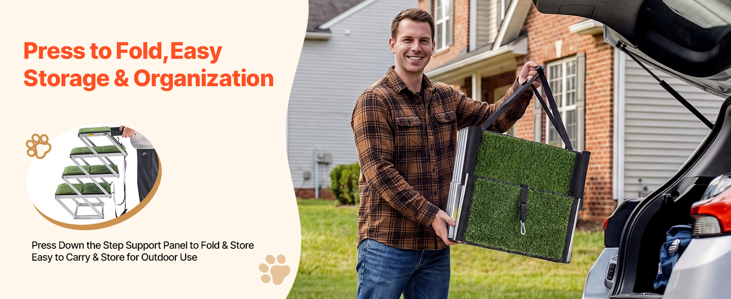 Naše skladacie schodíky pre veľké psy sú ľahké a prenosné, vhodné na každodenné použitie. Skladací dizajn umožňuje kompaktné uloženie vo vozidle alebo doma.