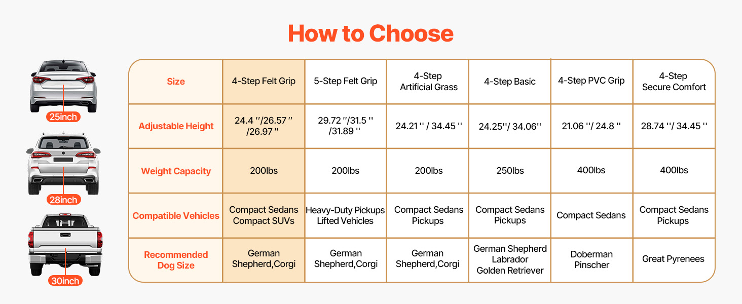 Naše schody do auta pre psov ponúkajú tri nastaviteľné výšky pre flexibilné použitie. Uľahčujú psom rôznych veľkostí pohodlné vyliezanie v rôznych situáciách.