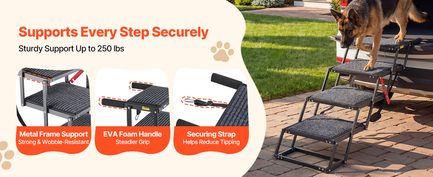 Tieto schody do auta pre psov sú vyrobené z vystuženého kovového rámu a poskytujú spoľahlivú stabilitu. Bezpečné upevnenie pomáha udržať vášho psa stabilného pri každom kroku.