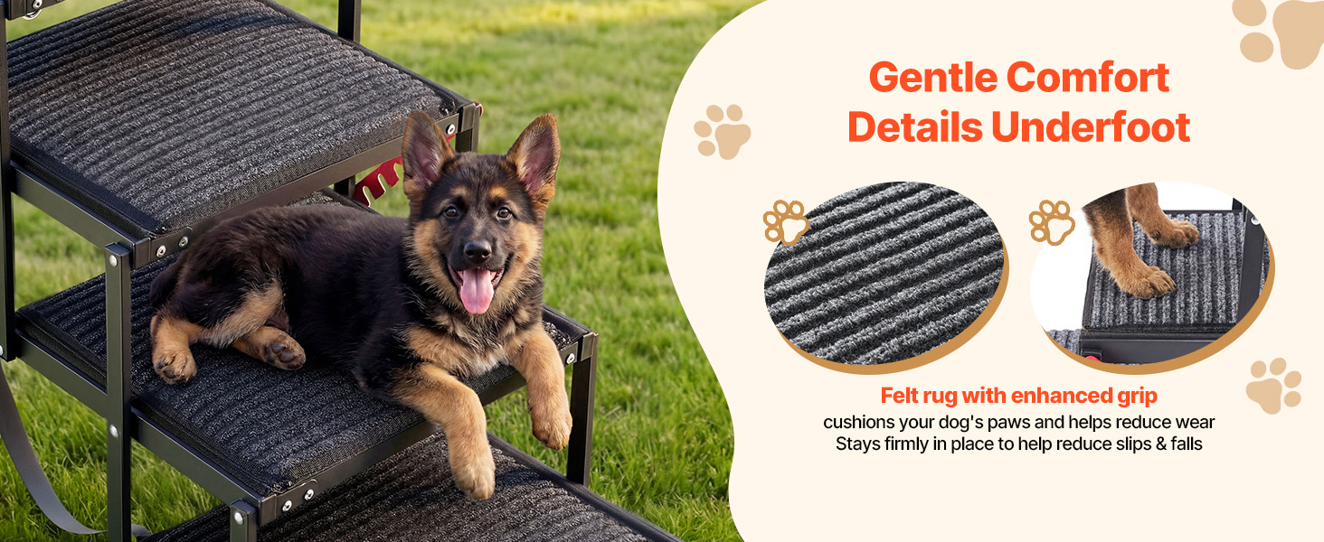 Tieto schody do auta pre veľké psy majú protisklzový povrch z plsti pre lepšiu trakciu. Mäkký materiál pomáha znižovať šmyknutie a znižuje riziko zranenia pri výstupe.