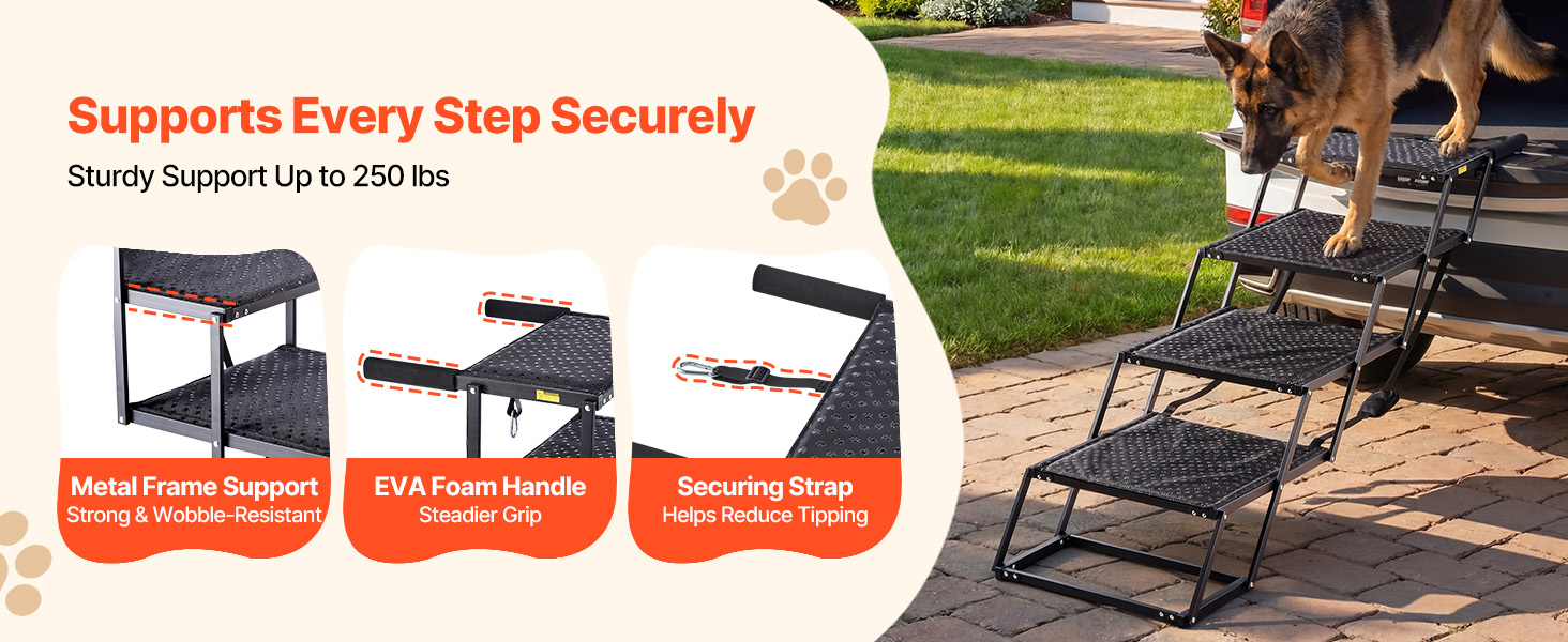 Tieto schody do auta pre psov sú vyrobené zo zosilneného kovového rámu a poskytujú spoľahlivú stabilitu. Bezpečné upevnenie pomáha udržať vášho psa stabilného pri každom kroku.