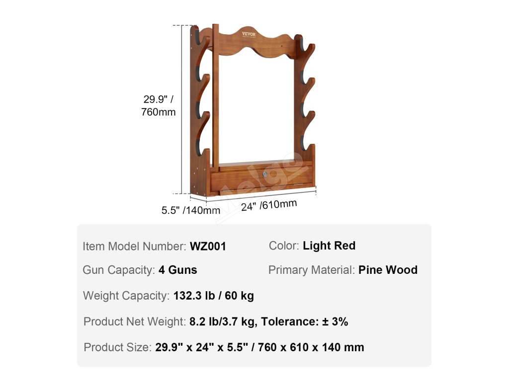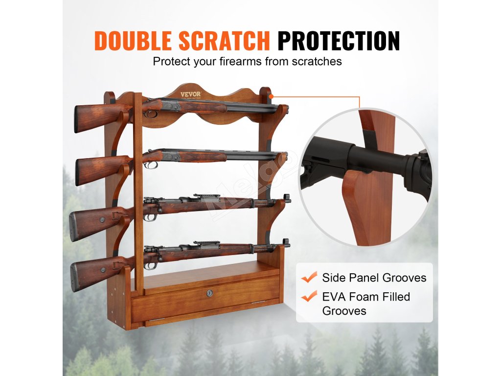 Drevený stojan na zbrane je špeciálne navrhnutý s mäkkým polstrovaním, ktoré zabezpečuje šetrnú starostlivosť o vaše strelné zbrane a zabraňuje ich poškriabaniu a poškodeniu. Drážky bočného panelu sú vyplnené mäkkou penou EVA, ktorá poskytuje vynikajúcu ochranu a bezpečné umiestnenie pre vaše strelné zbrane.