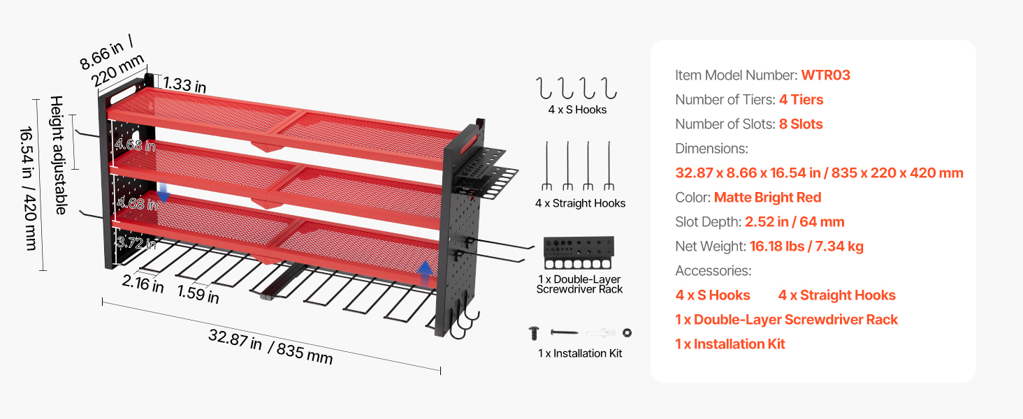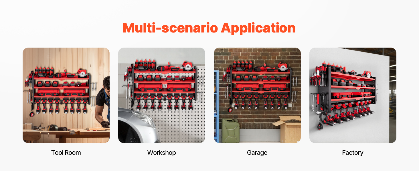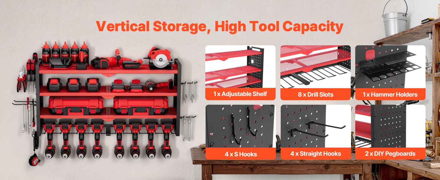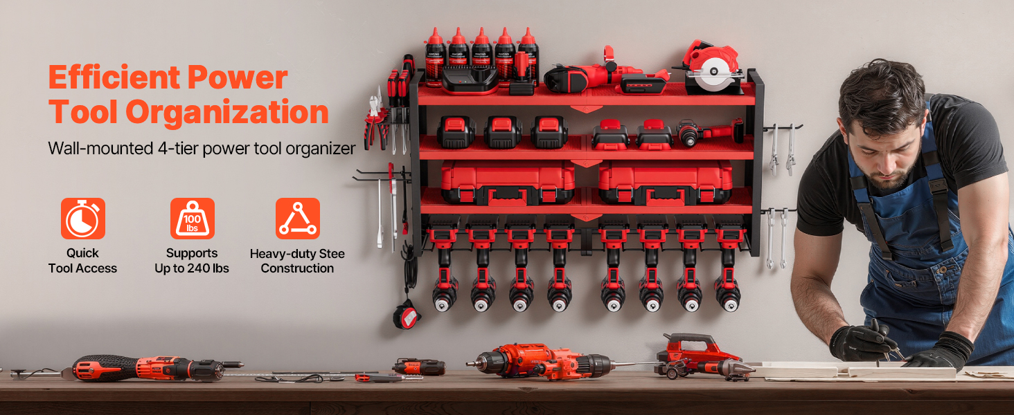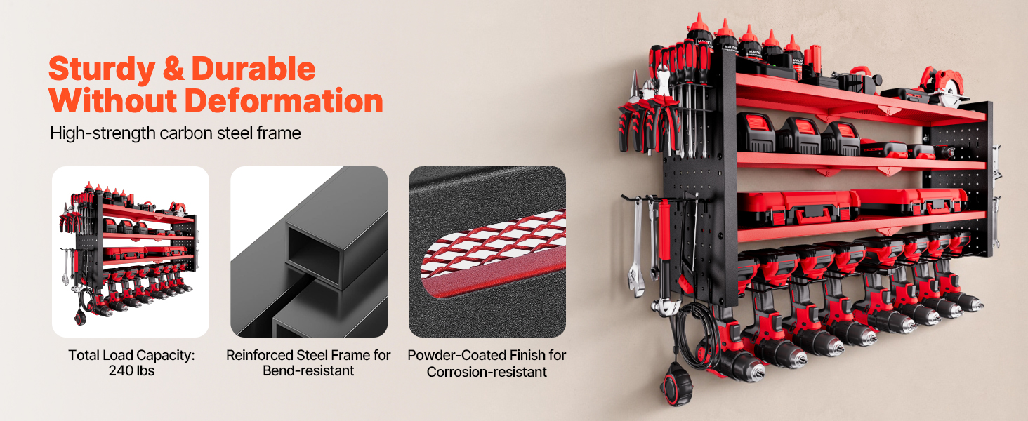 Tento nástenný 4-úrovňový organizér na elektrické náradie ponúka rýchly prístup k náradiu. Jeho robustný rám z uhlíkovej ocele unesie až 240 kg, čo uľahčuje ukladanie vŕtačiek, skríň s náradím a ďalších nástrojov pre uprataný pracovný priestor bez starostí.