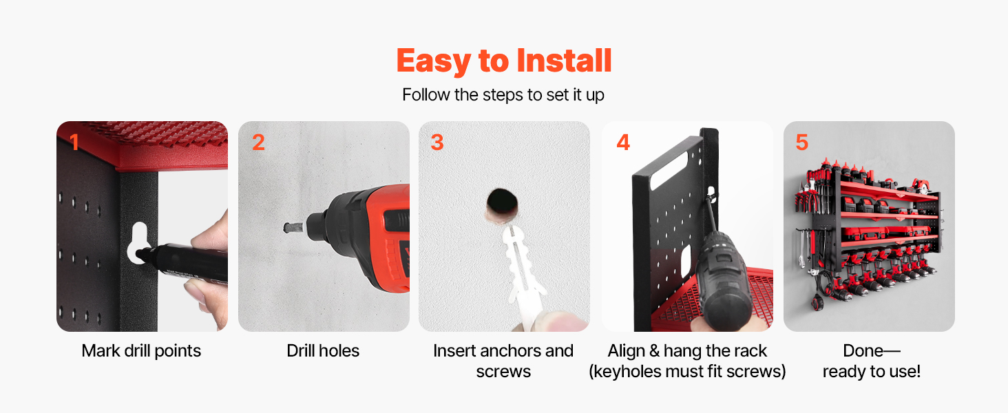 Náš organizér na vŕtačky sa dodáva s jasným návodom krok za krokom a všetkým potrebným hardvérom vrátane rozpernej skrutky na rýchlu a jednoduchú montáž na stenu. Takže ho môžete bez problémov nastaviť v priebehu niekoľkých minút.