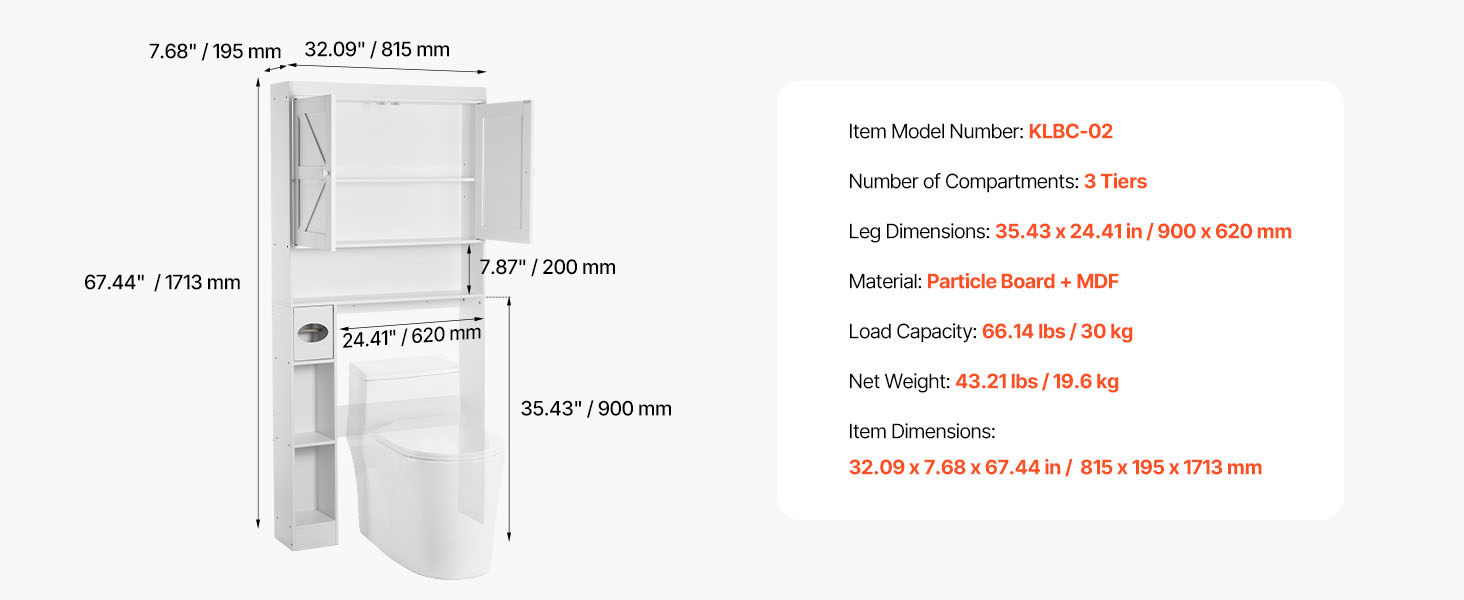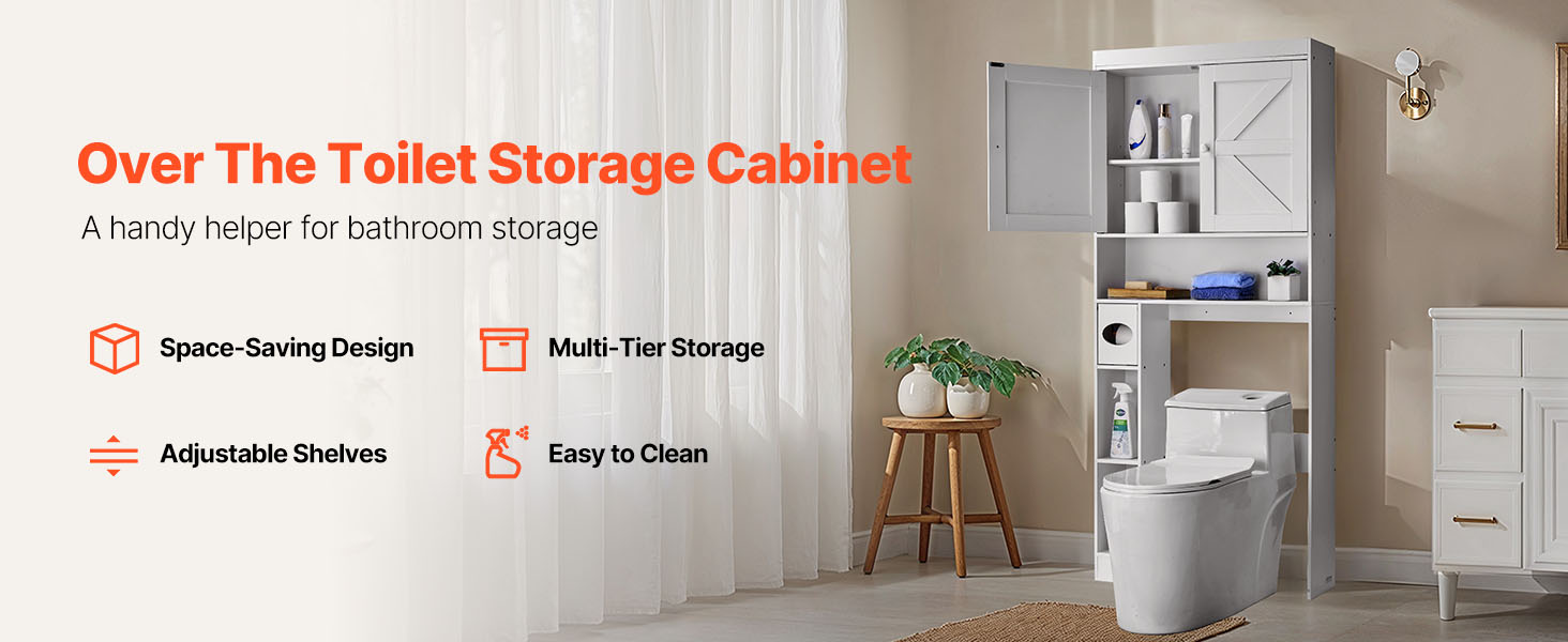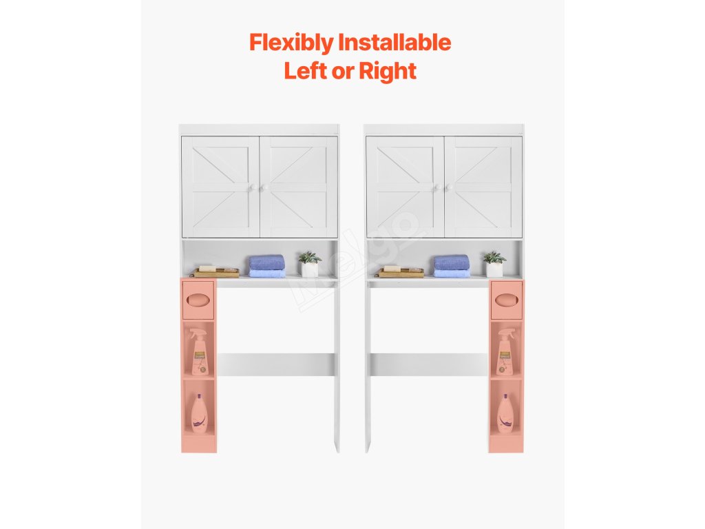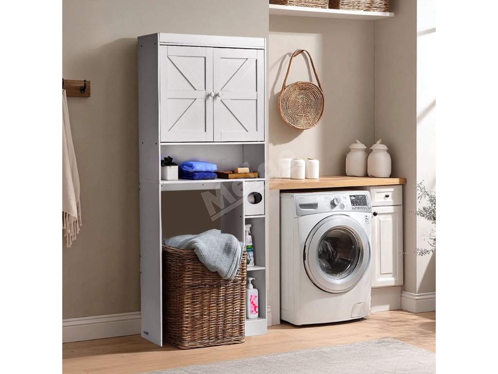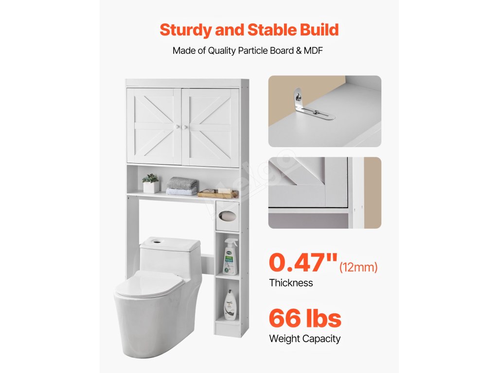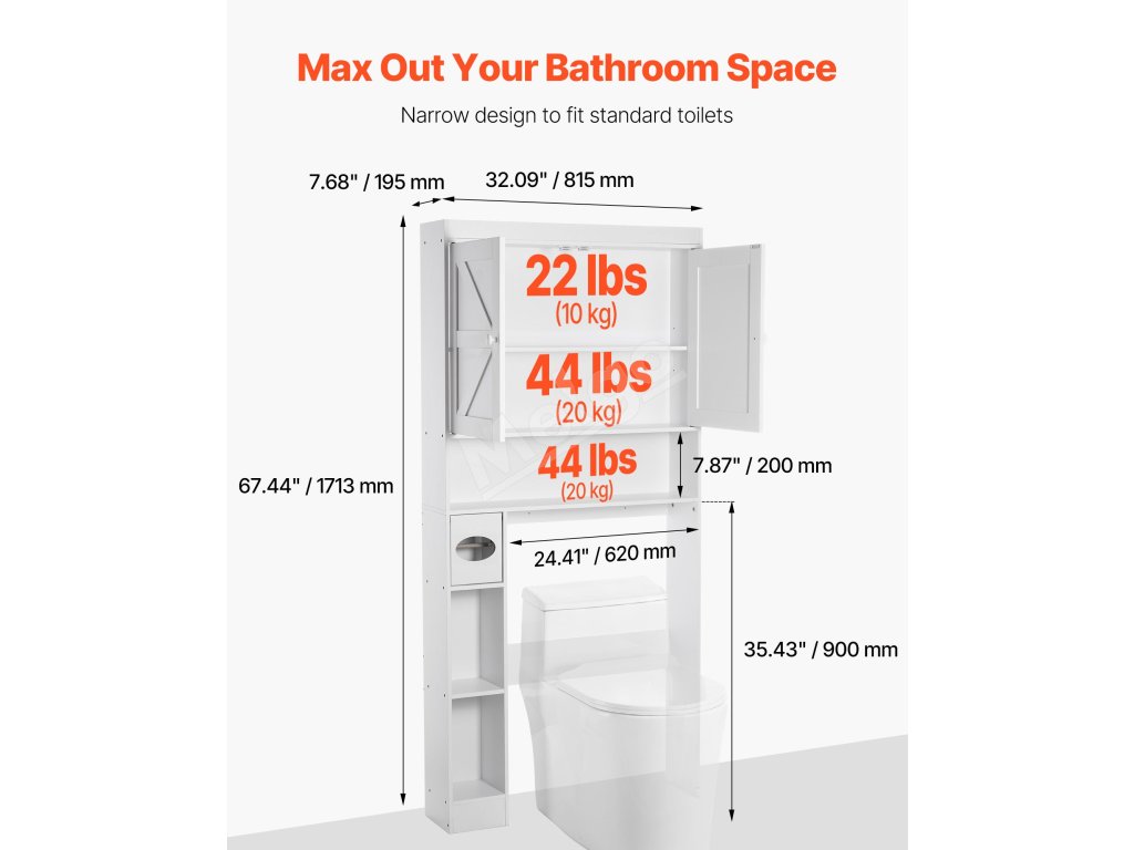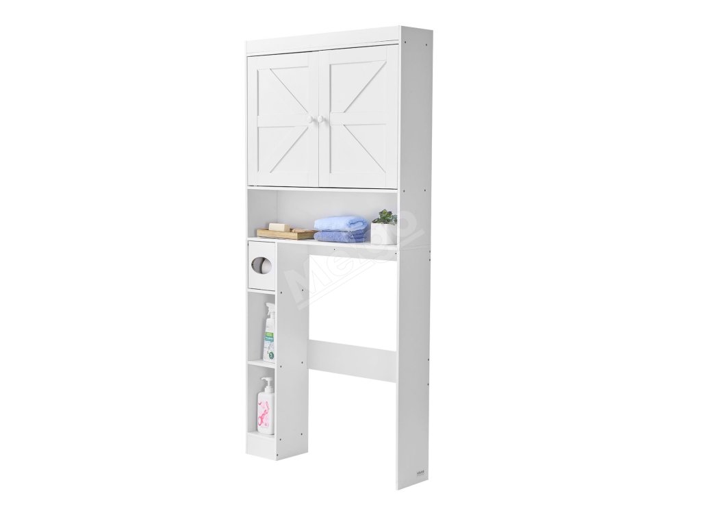 Táto skrinka sa hodí nad štandardné toalety, aby sa ušetril priestor. Je vyrobená z drevotrieskových dosiek a MDF a unesie až 66 kg. Je vybavená súpravou proti prevráteniu, viacúrovňovým úložným priestorom a nastaviteľnými policami. Čistý dizajn sa hodí k akémukoľvek interiéru.