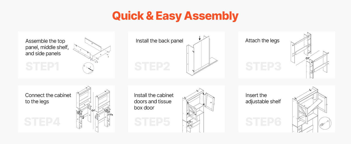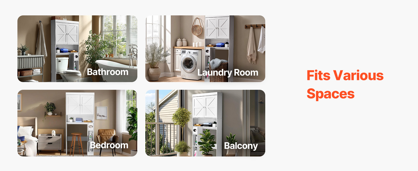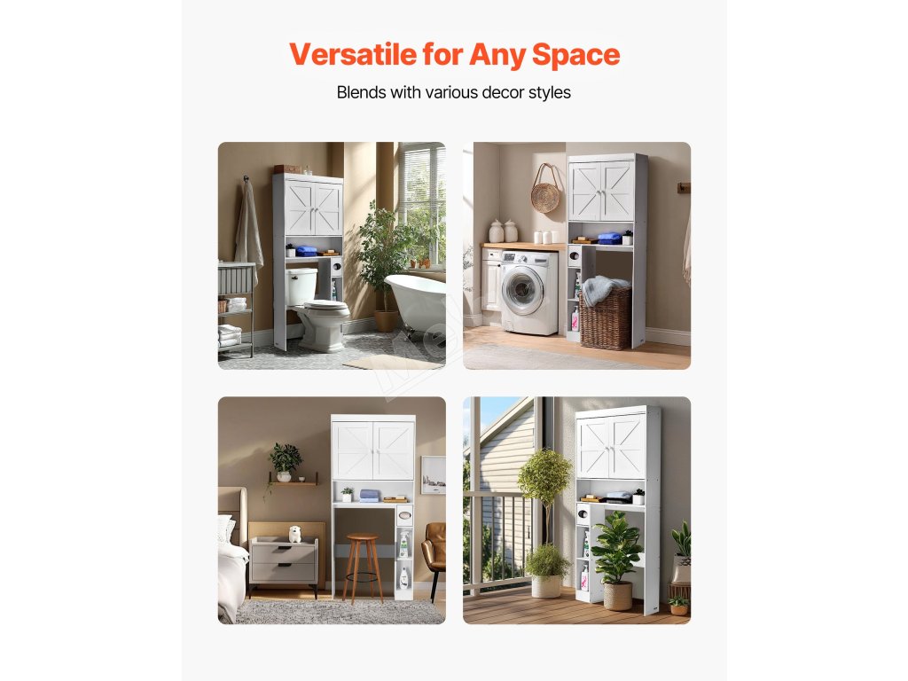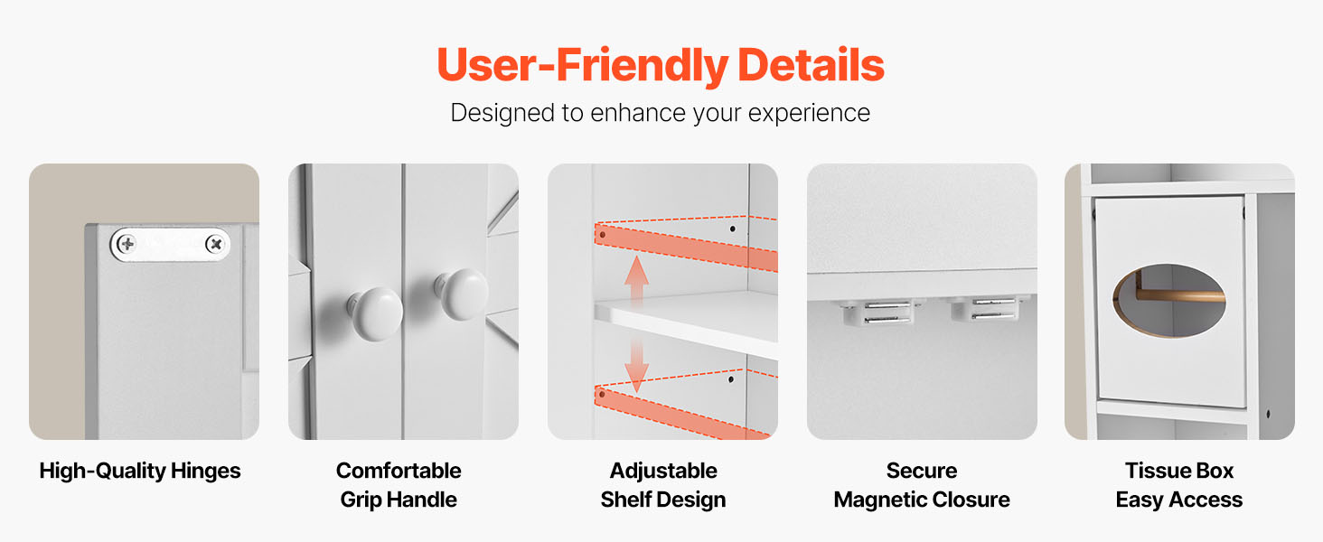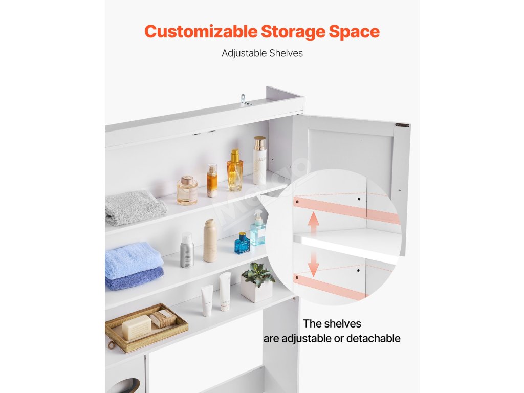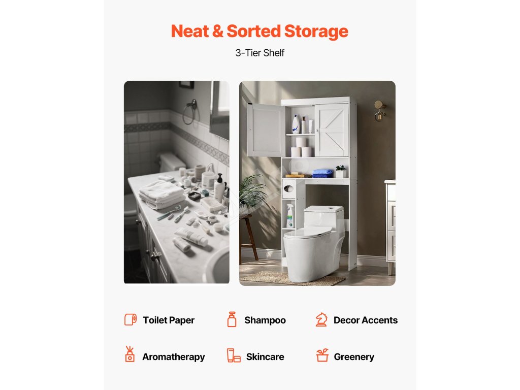 Táto skrinka sa hodí nad štandardné toalety, aby sa ušetril priestor. Je vyrobená z drevotrieskových dosiek a MDF a unesie až 66 kg. Je vybavená súpravou proti prevráteniu, viacúrovňovým úložným priestorom a nastaviteľnými policami. Čistý dizajn sa hodí k akémukoľvek interiéru.