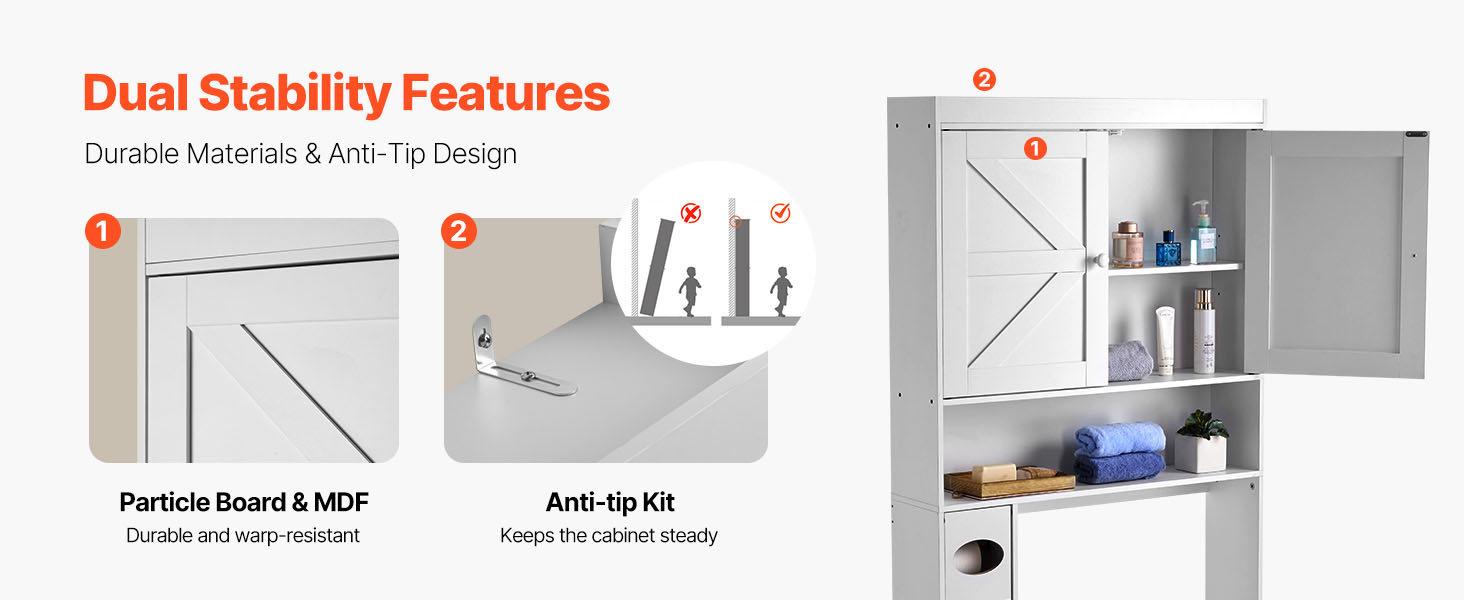 Táto úložná skrinka nad toaletu vyrobená z drevotrieskových dosiek a MDF so súpravou proti prevráteniu poskytuje silnú nosnosť a spoľahlivú oporu pri každodennom používaní.