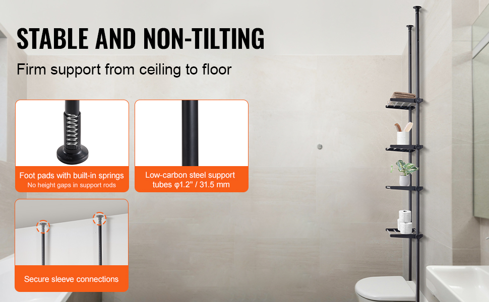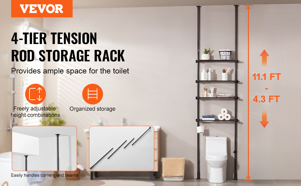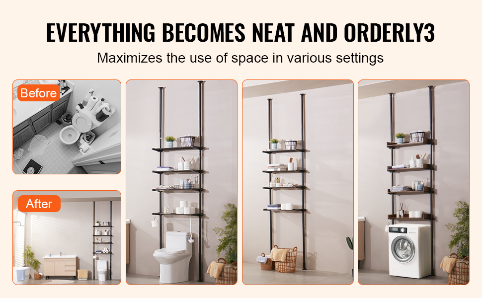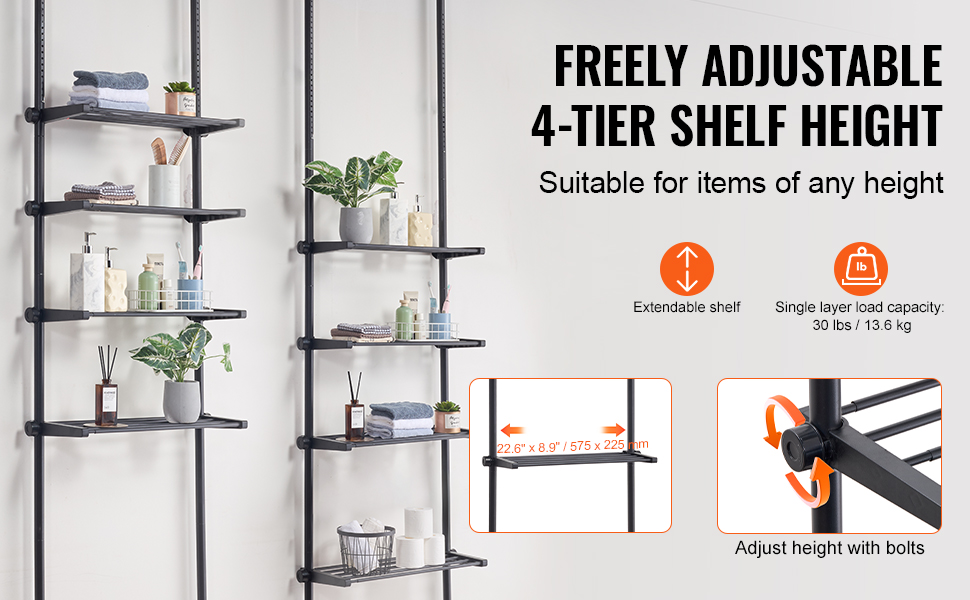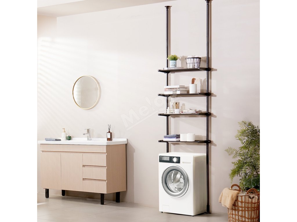 Matice na stranách teleskopických tyčových políc umožňujú voľné nastavenie výšky políc, čím sa prispôsobia predmetom rôznej výšky. Šírku nosného rámu možno tiež nastaviť podľa nábytku pod ním, vďaka čomu je tento úložný regál nad WC vhodnejší do úzkych priestorov.