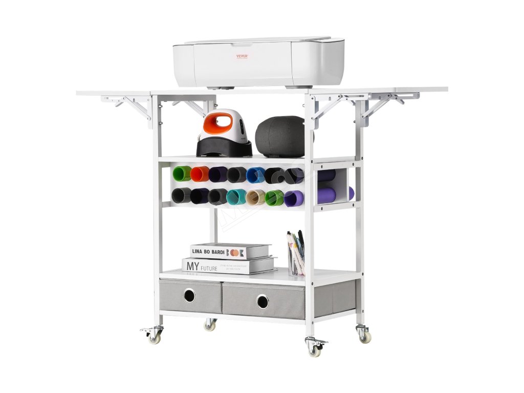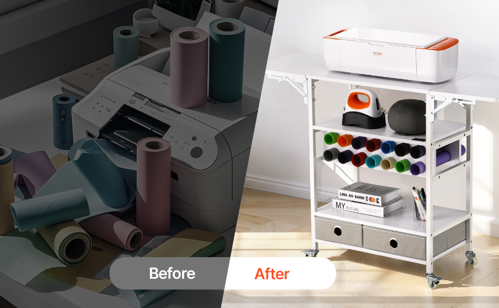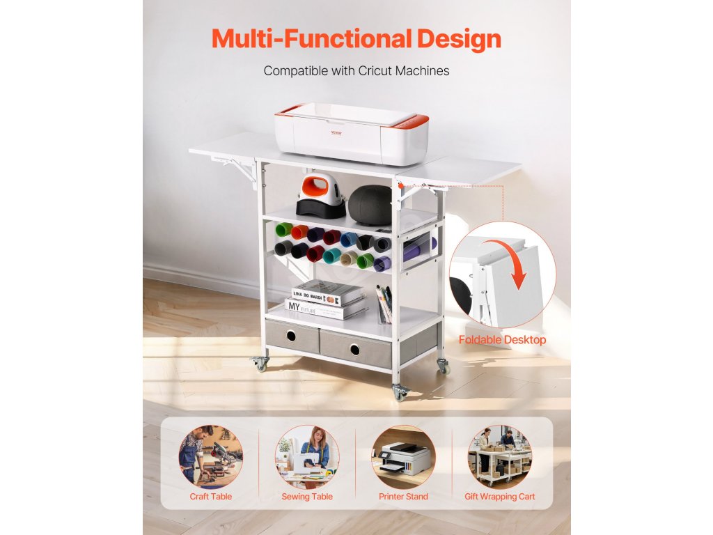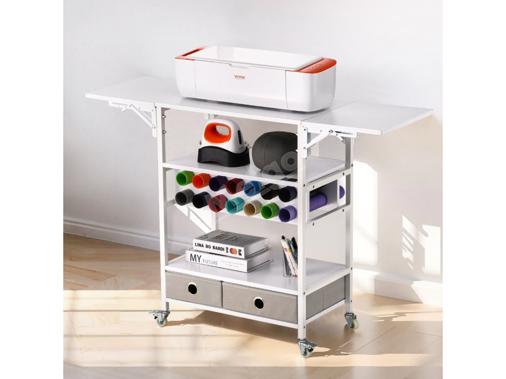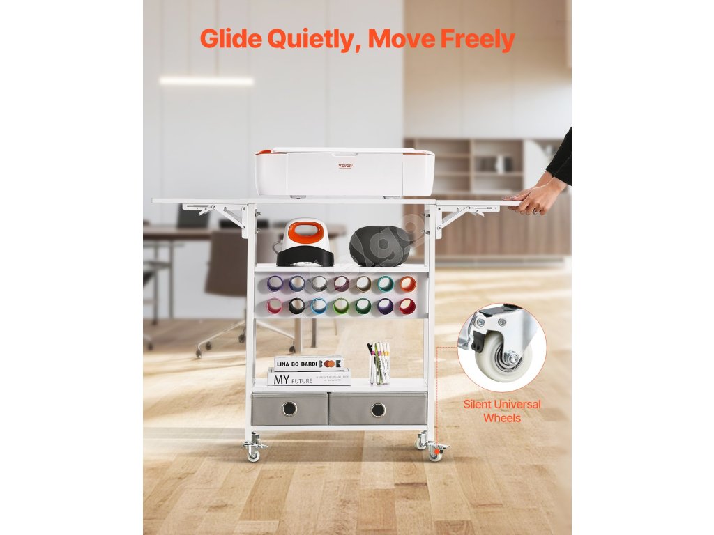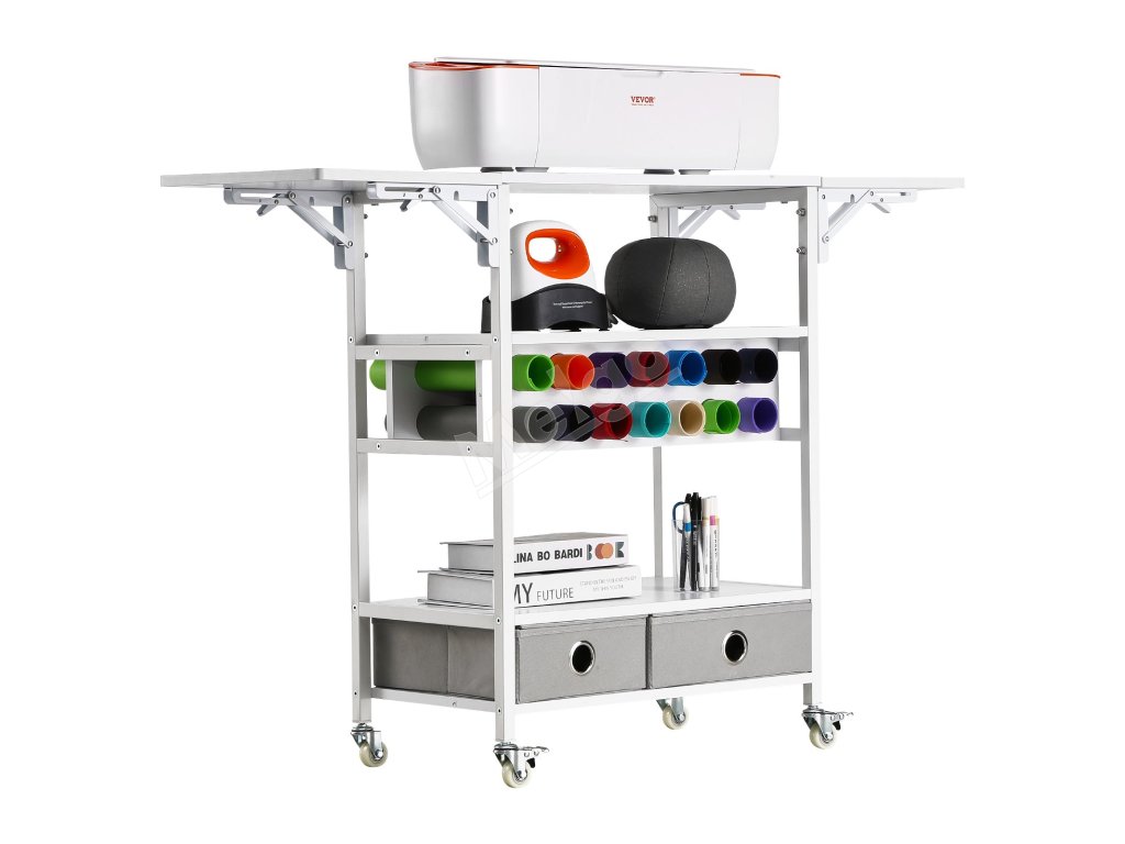 Tento pojazdný remeselný vozík a odkladací stolík je kompatibilný so všetkými rezacími strojmi. Okrem toho sa môže premeniť na stanicu tepelného lisu, stojan na tlačiareň, šijací vozík, stolík na balenie darčekov alebo každodennú odkladaciu skrinku, aby vyhovoval vašim rôznorodým potrebám pri tvorbe a v domácnosti.