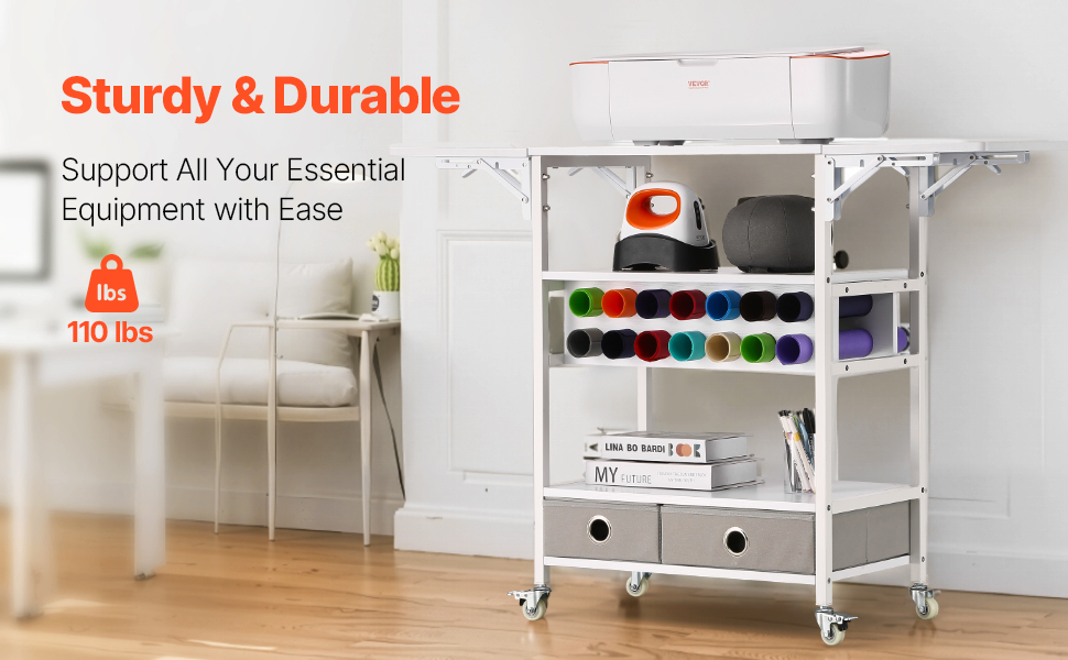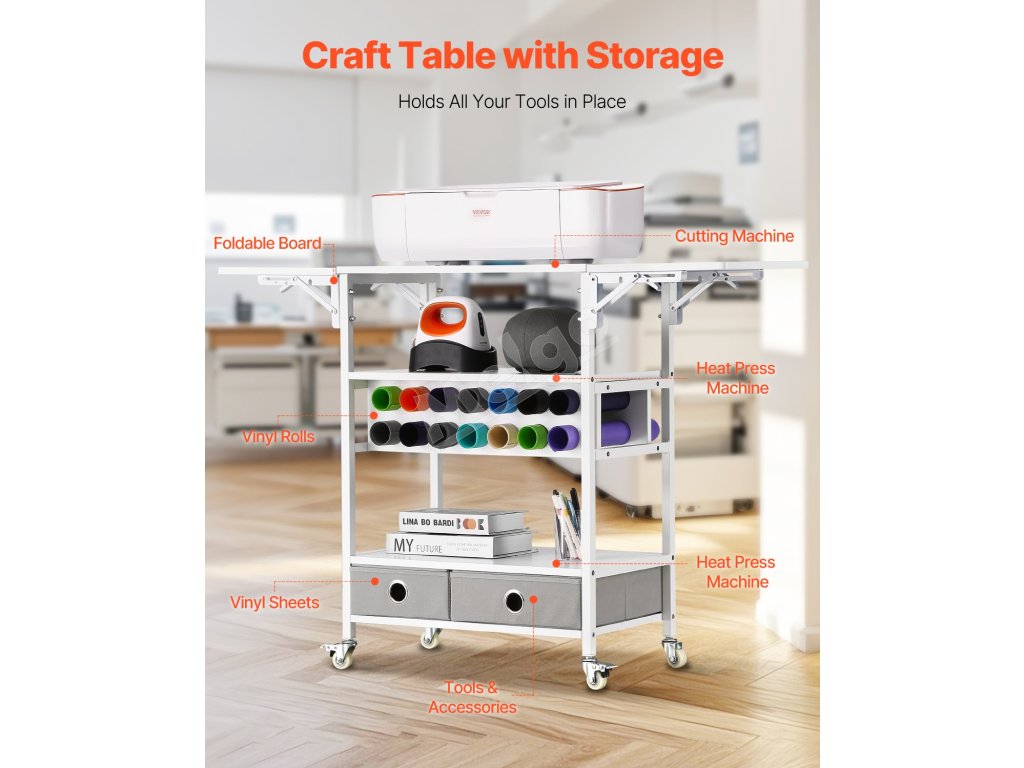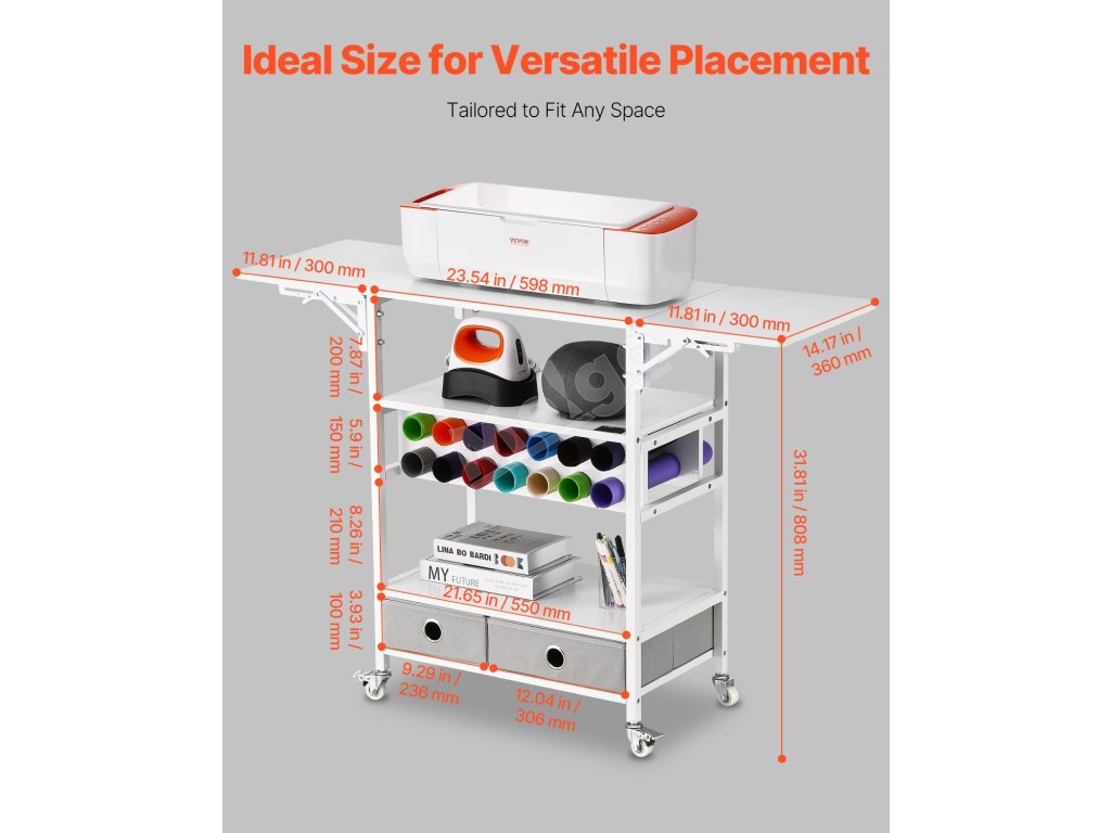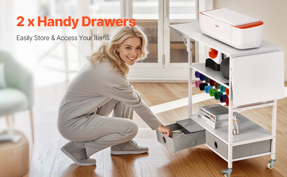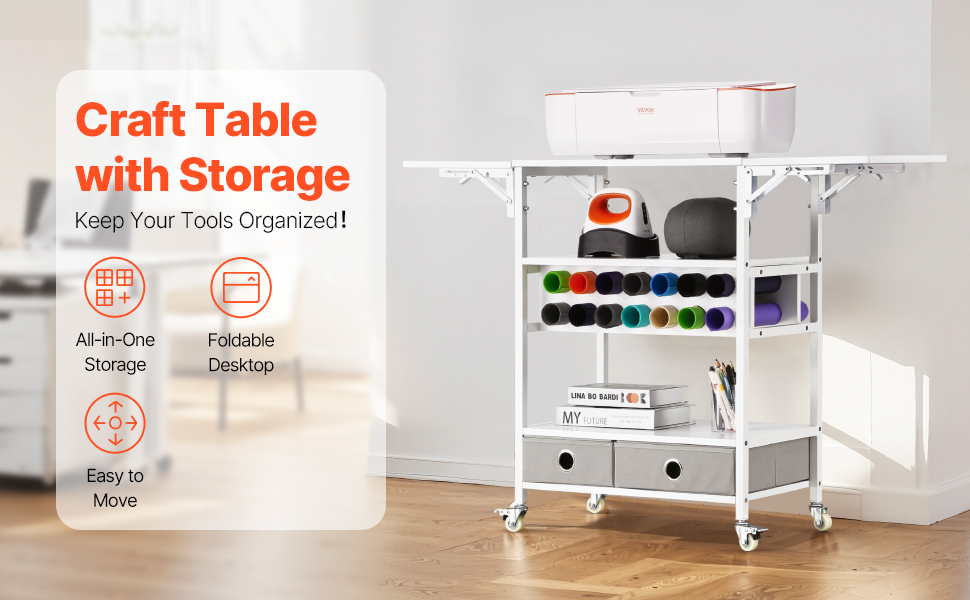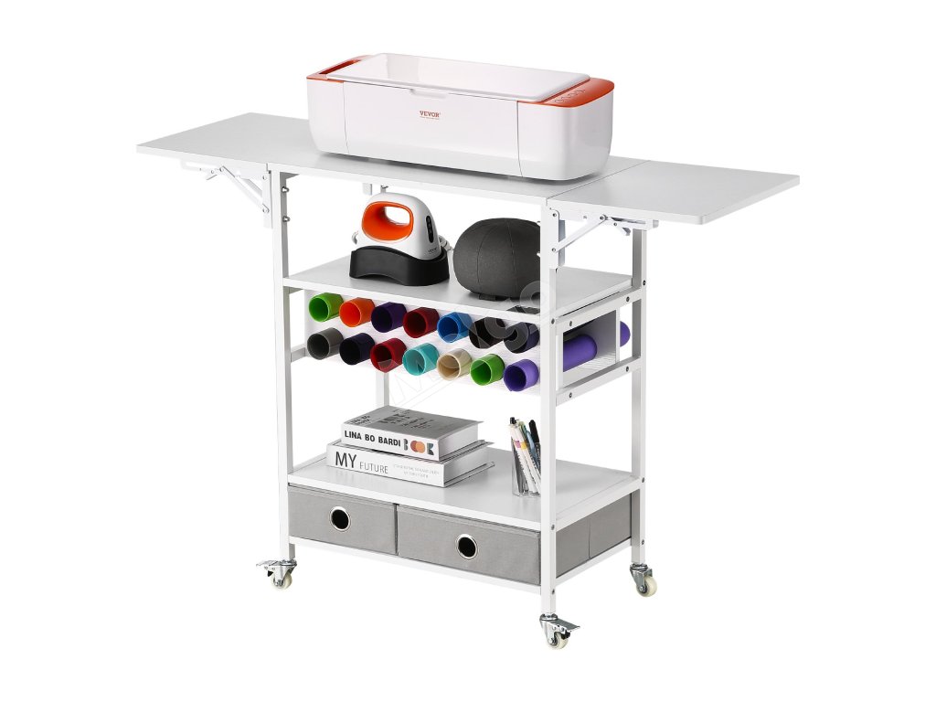 Tento pojazdný remeselný vozík a odkladací stolík je kompatibilný so všetkými rezacími strojmi. Okrem toho sa môže premeniť na stanicu tepelného lisu, stojan na tlačiareň, šijací vozík, stolík na balenie darčekov alebo každodennú odkladaciu skrinku, aby vyhovoval vašim rôznorodým potrebám pri tvorbe a v domácnosti.