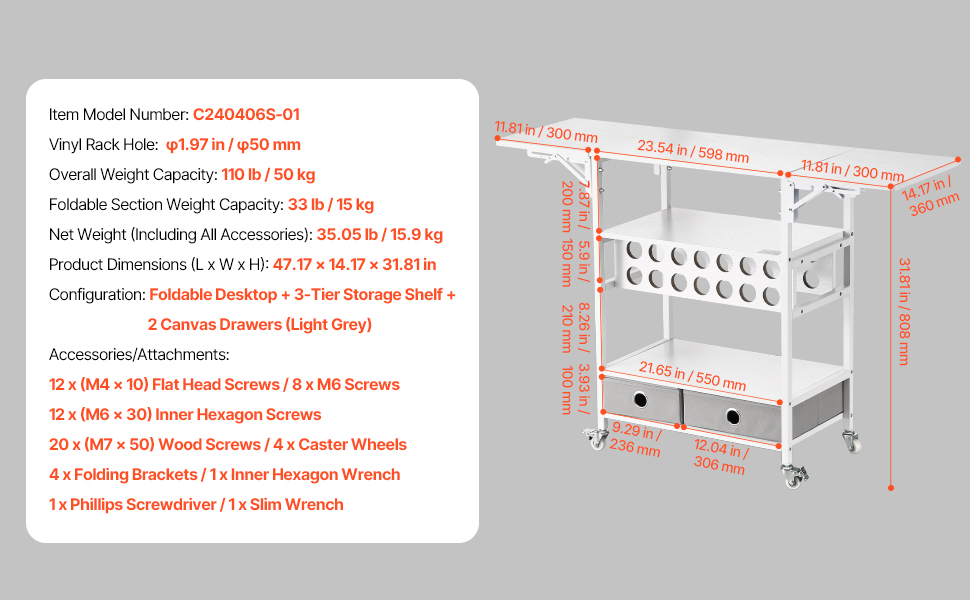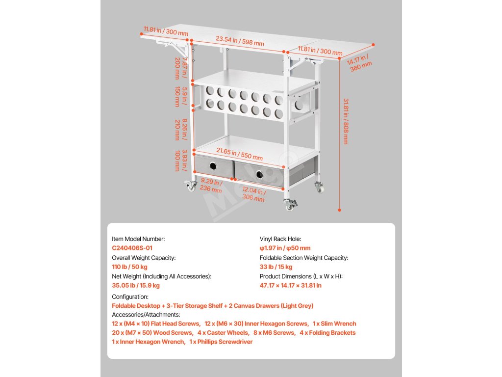 | Konfigurácia | Skladacia pracovná doska + 3-úrovňová odkladacia polica + 2 plátenné zásuvky (svetlosivá) |