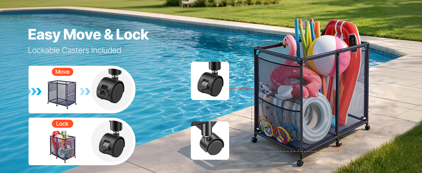 Tento držiak na plavecké pomôcky je vybavený hladkými, tichými uzamykateľnými kolieskami, ktoré uľahčujú presúvanie do rôznych oblastí, a brzdami, ktoré ho bezpečne udržujú na mieste.
