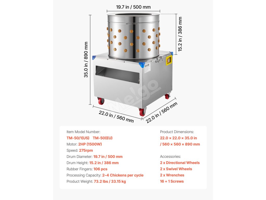 Stroj na oškáranie hydiny 19.7 in bubon, 2HP, 275RPM, 106 prstov