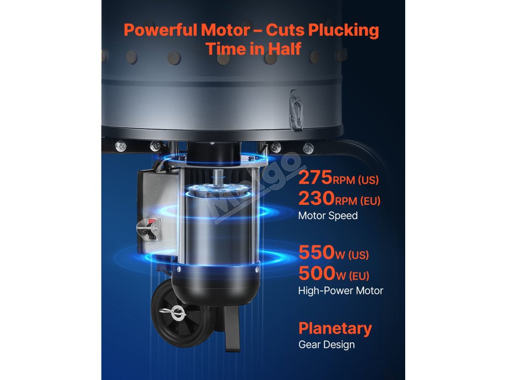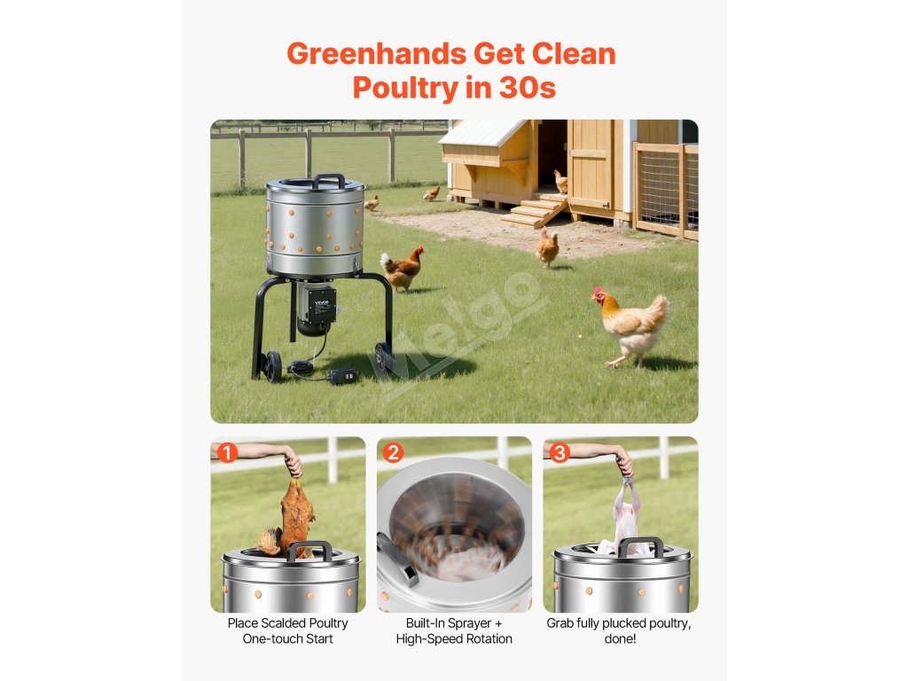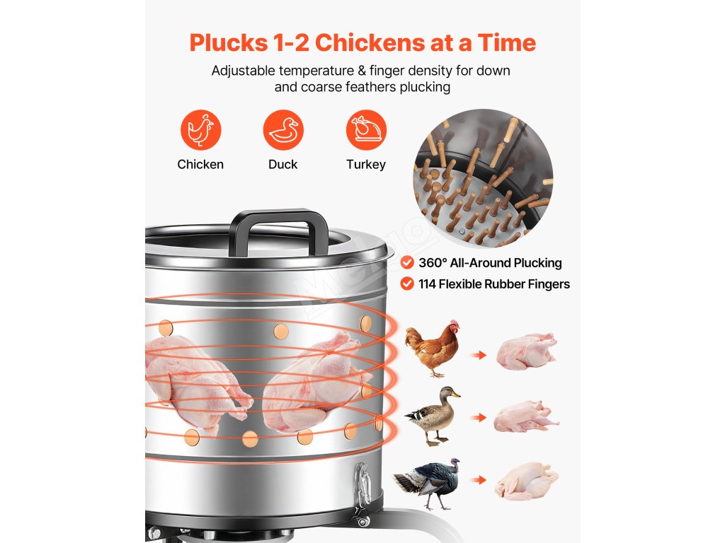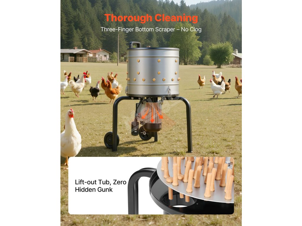 Táto elektrická šklbačka na kurčatá, vyrobená z nehrdzavejúcej ocele a s mäkkými gumovými prstami, je ideálna na šklbanie peria zo stredne veľkej až veľkej hydiny. Účinne a s jemnou presnosťou si poradí s kurčatami, kačicami a moriakmi.