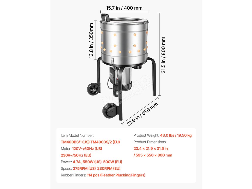 Stroj na oškubávanie kurčiat 400 mm bubon, 500 W, 230 rpm, 114 prstov