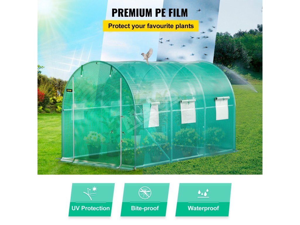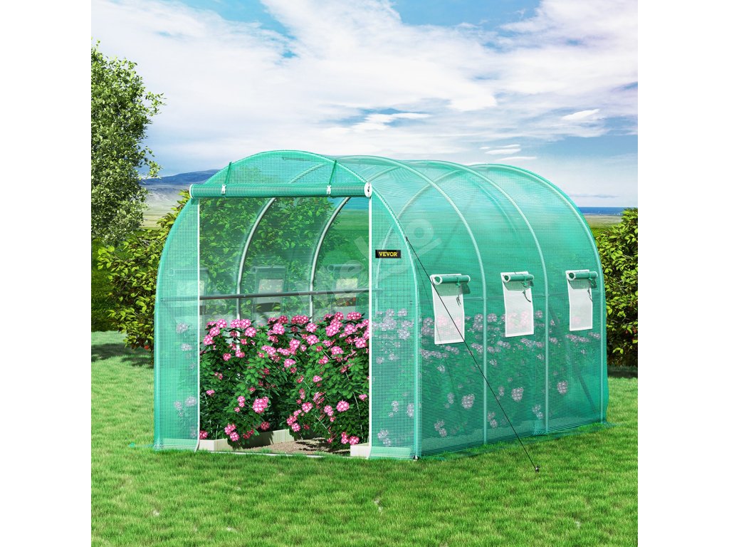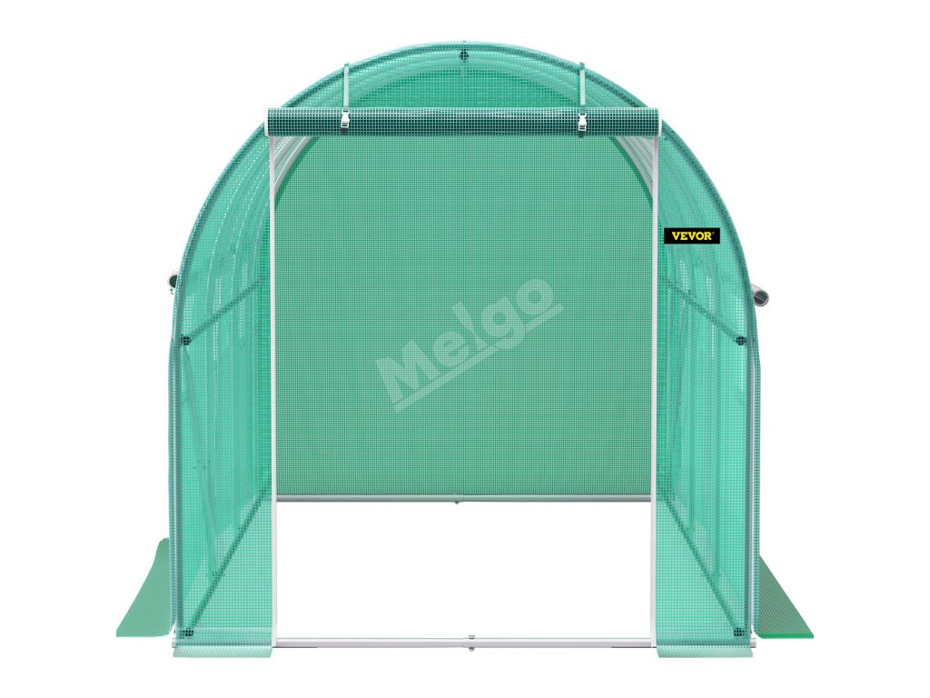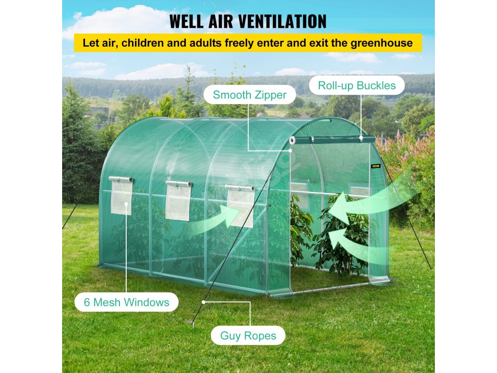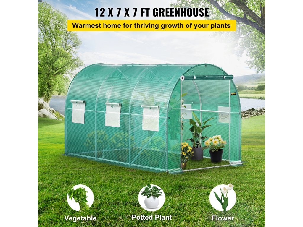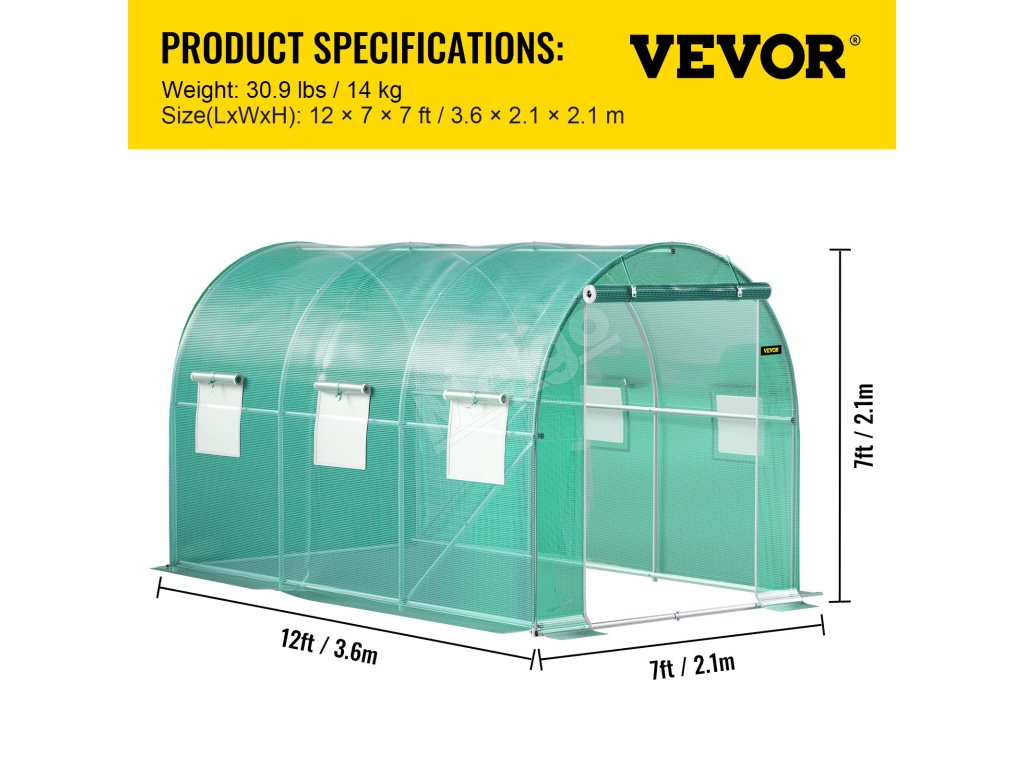 Rozmery: 12 x 7 x 7 stôp / 3,7 x 2,1 x 2,1 m Náš tunelový skleník má veľký úložný priestor s jednými dverami a 6 oknami so sieťovinou na zvýšenie prúdenia vzduchu, aby sa rastlinám darilo.