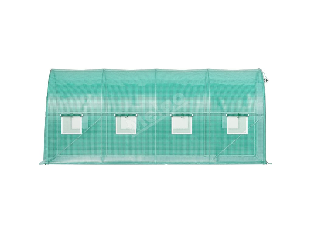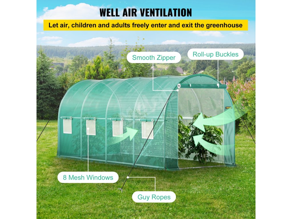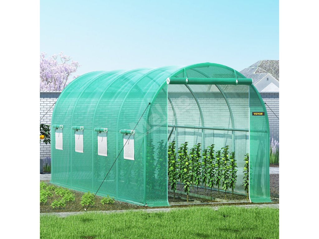 Rozmery: 4,5 x 2 x 2 m/14,8 x 6,6 x 6,6 m. Náš tunelový skleník má veľký úložný priestor s jednými dverami a 8 oknami zo sieťoviny, ktoré zvyšujú prúdenie vzduchu, aby sa rastlinám darilo.
