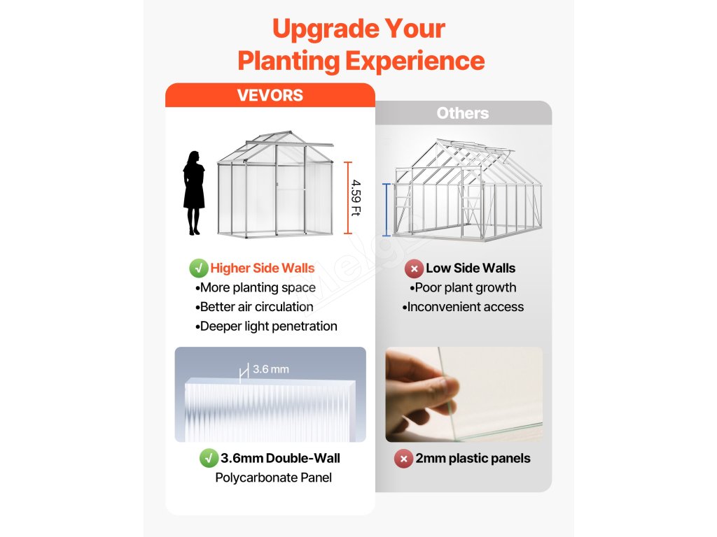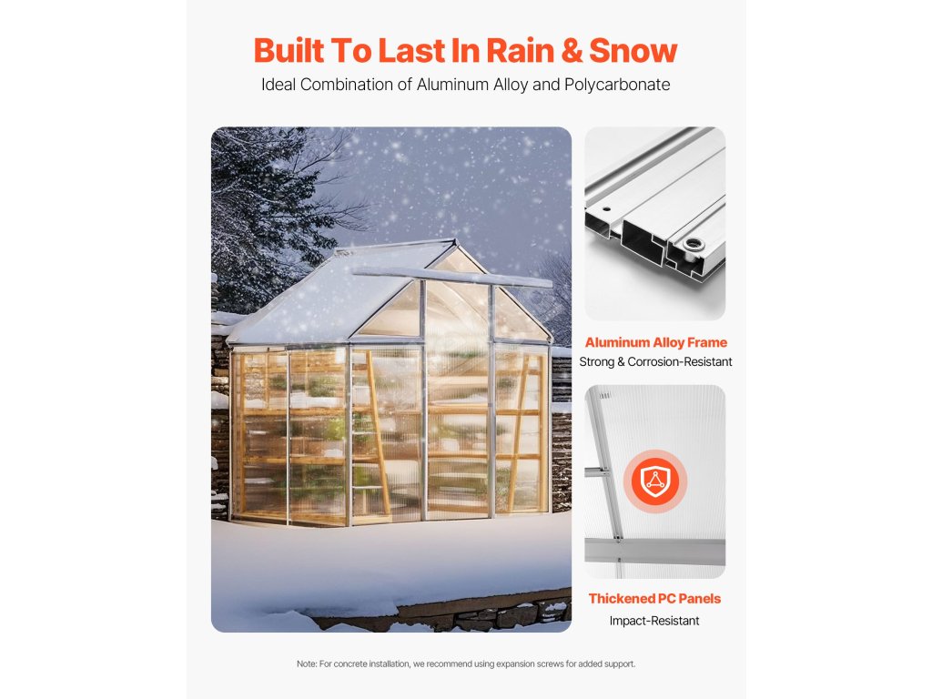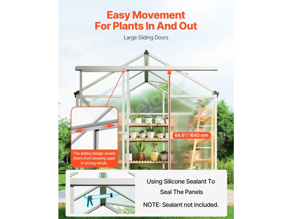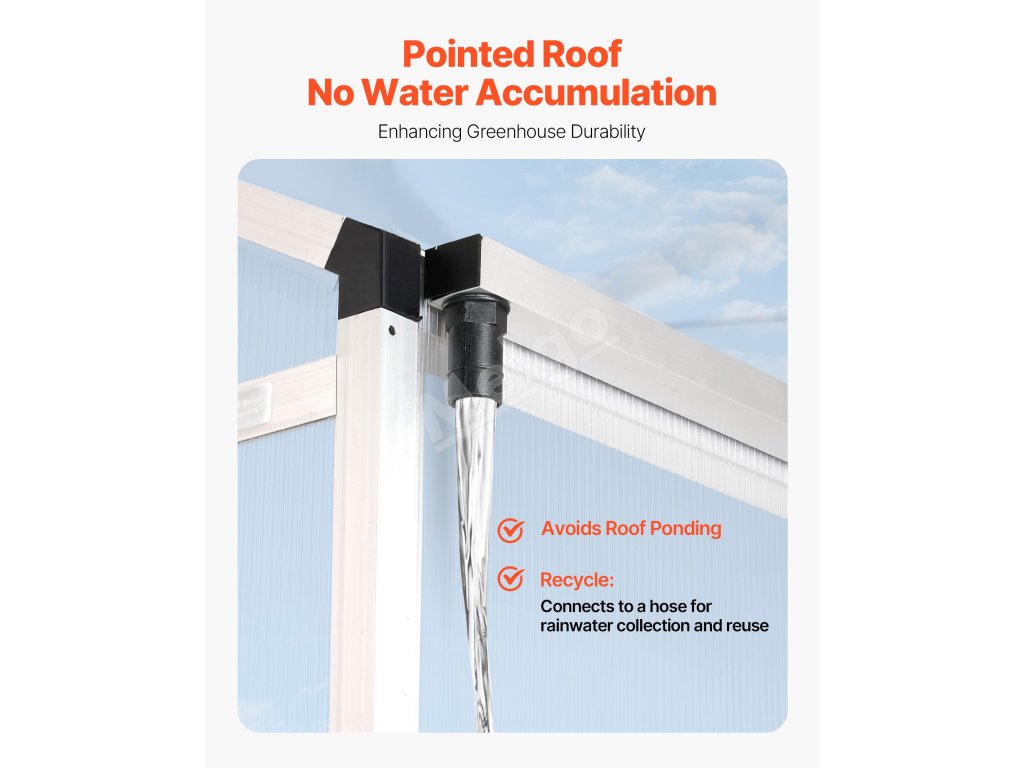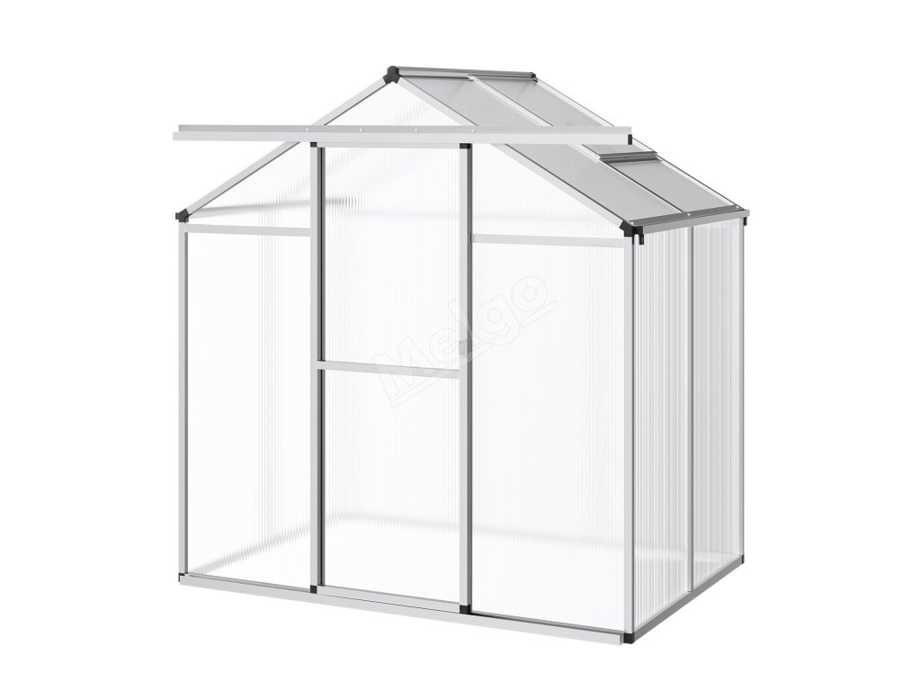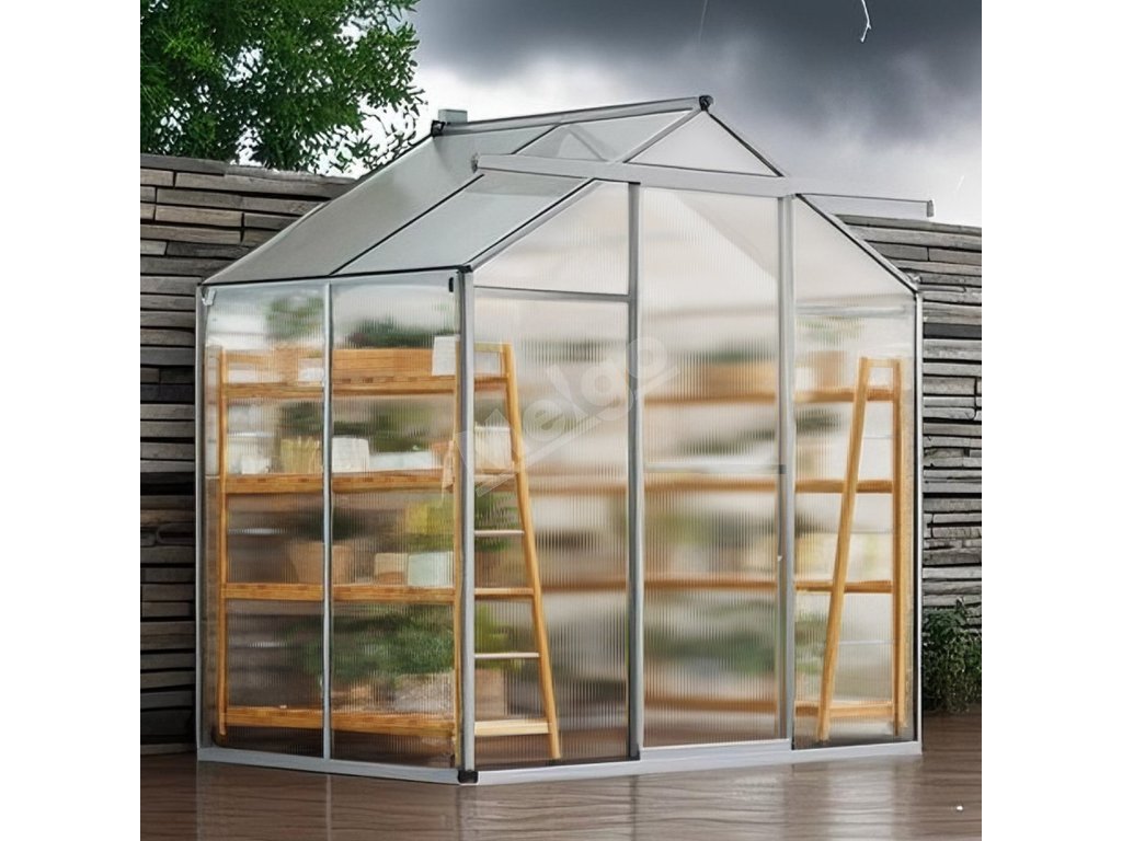 Tento polykarbonátový skleník má odolný rám z hliníkovej zliatiny a nárazuvzdorné PC panely s 89% priepustnosťou svetla pre odolnosť voči UV žiareniu. Veľké otváracie dvere a trojstupňovo nastaviteľné strešné okná zabezpečujú účinné vetranie. Môže fungovať ako slnečná miestnosť a záhradná izba.