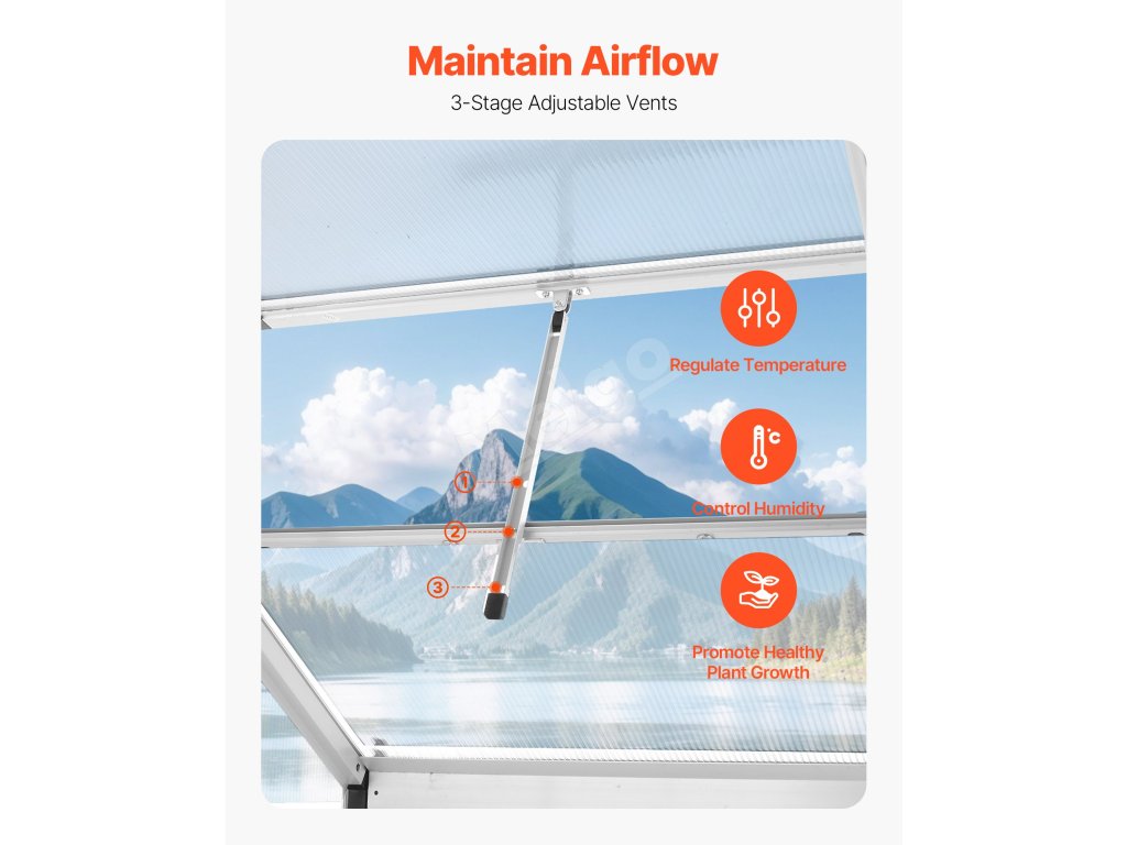 Vedecký systém vetrania v skleníku zabezpečuje plynulú cirkuláciu vzduchu prostredníctvom veľkých posuvných dverí a 3-stupňových nastaviteľných strešných vetracích otvorov. To pomáha predchádzať vysokým teplotám alebo nadmernej vlhkosti, ktoré môžu spôsobiť hnilobu rastlín.