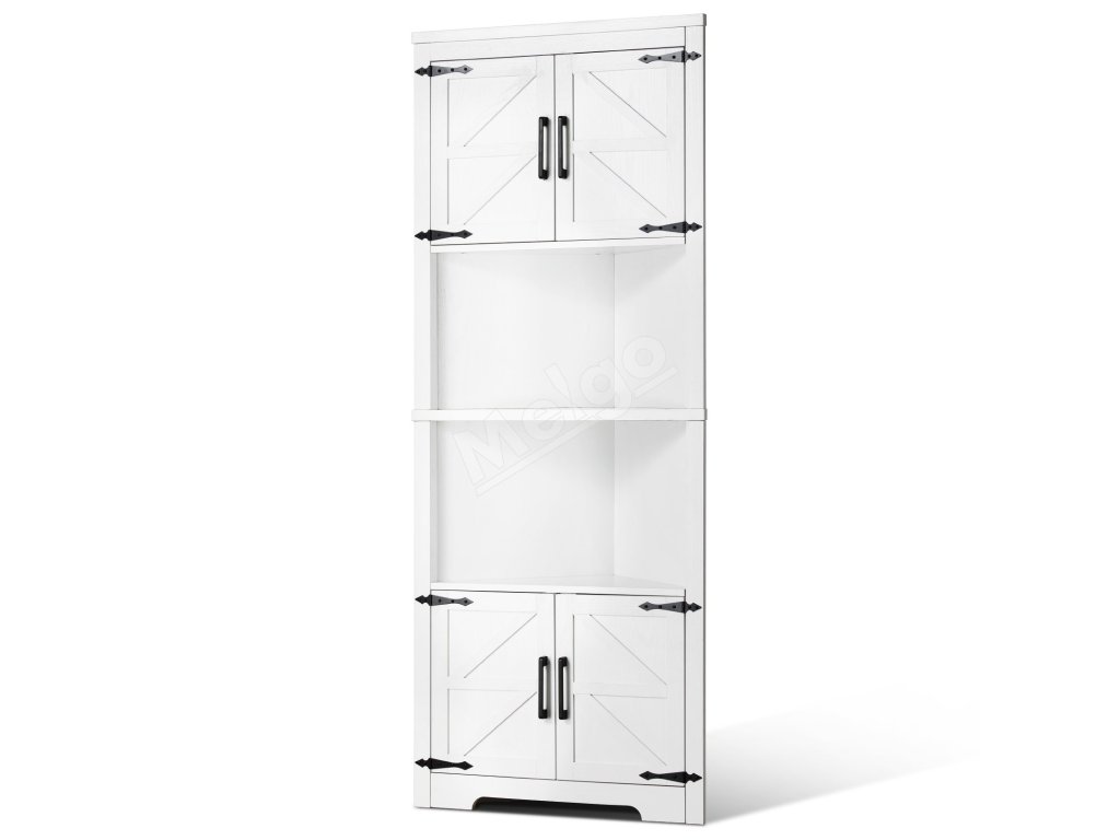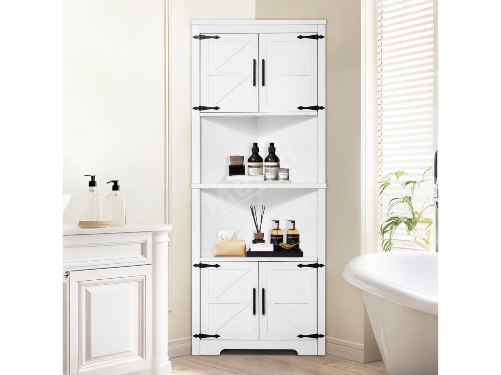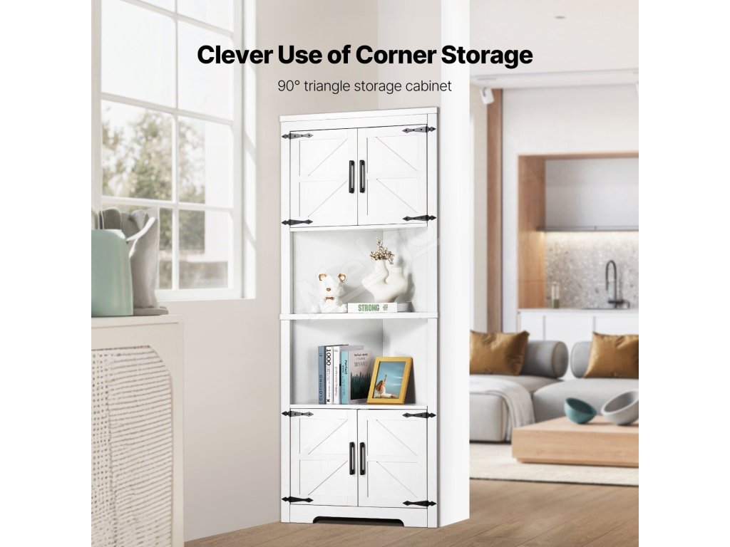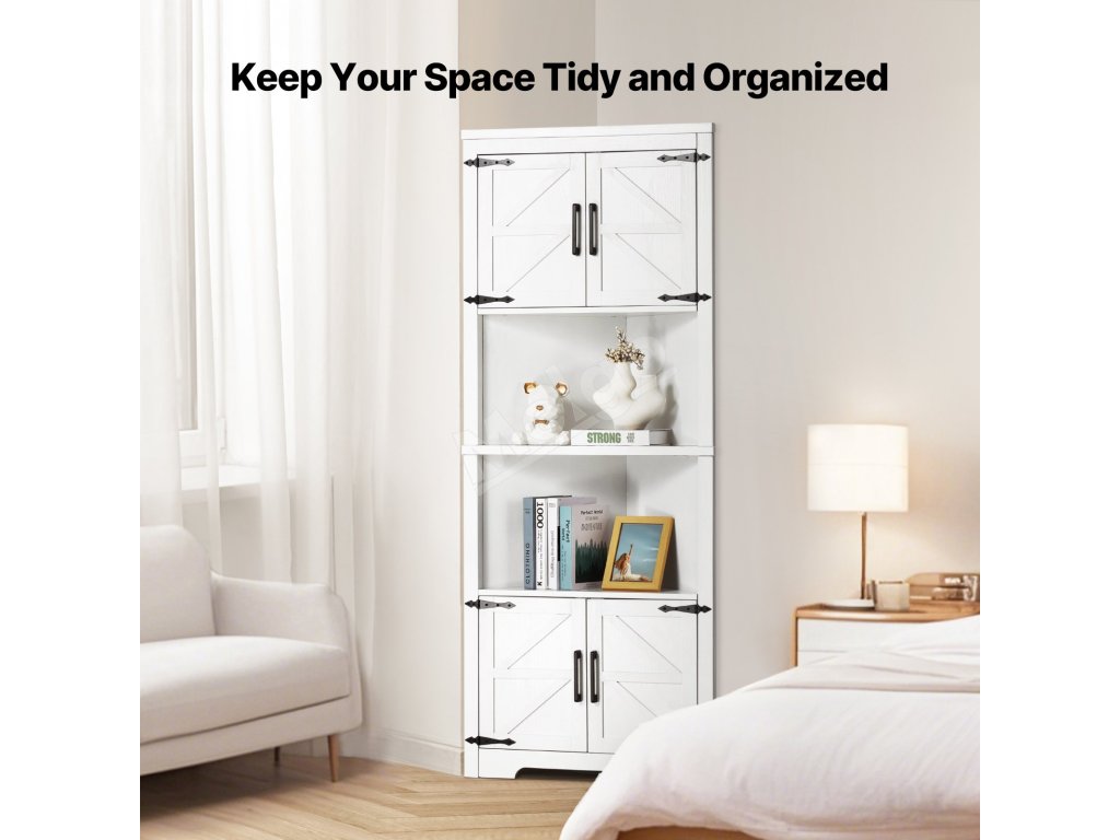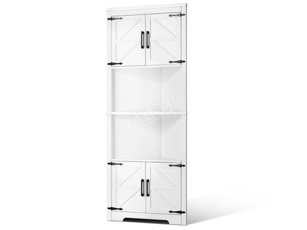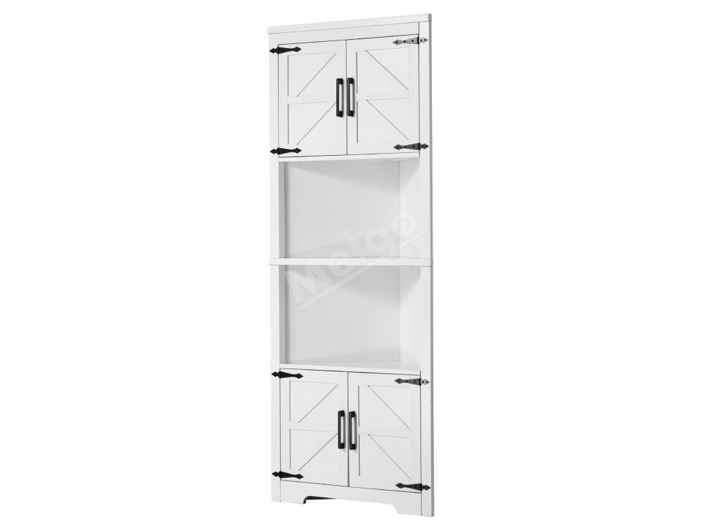 Rohová vysoká skrinka 6 nastaviteľných políc, 4 drevené dvierka, biela