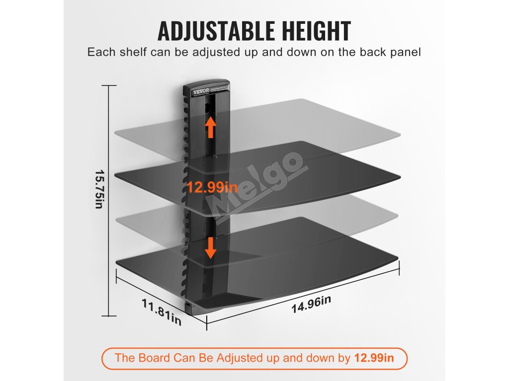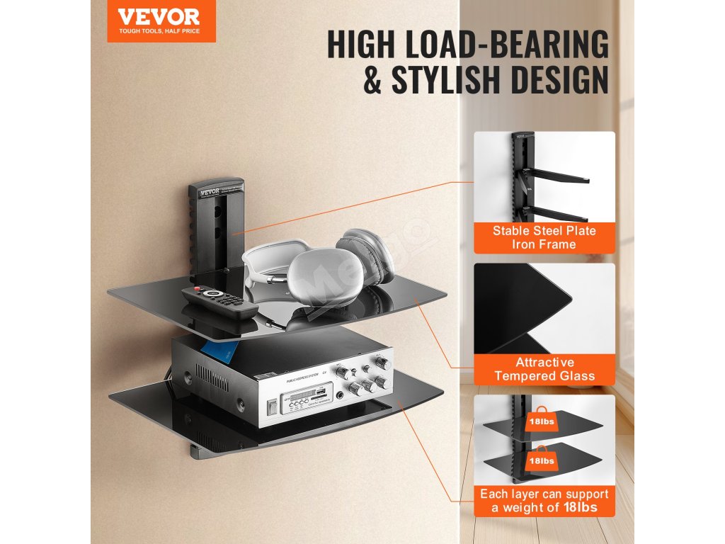 Tento nástenný stojan na audio-video nosí až 18 kg na jednu policu a je vybavený odolným tvrdeným sklom odolným proti poškriabaniu a stabilným rámom z oceľového plechu.
