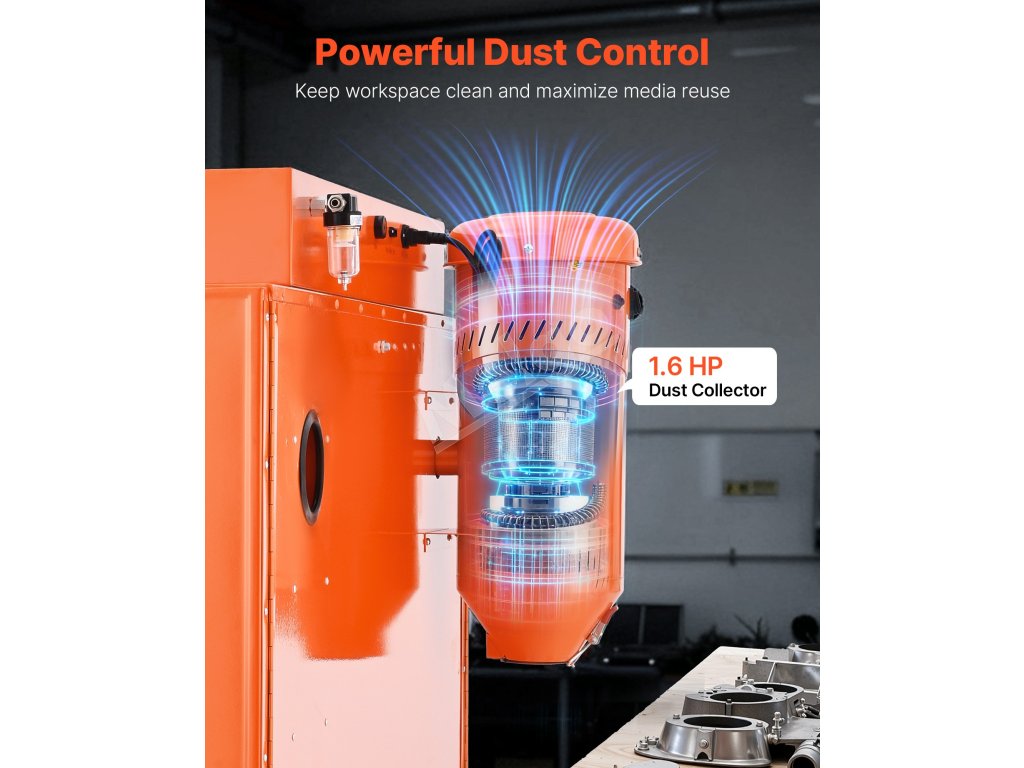 1.výkonný zberač prachu s výkonom 6 HP poskytuje silné odsávanie na zachytávanie prachu, regeneráciu médií a zabezpečuje bezpečné a čisté pracovné prostredie. Pomáha vám efektívnejšie vykonávať úlohy pieskovania.