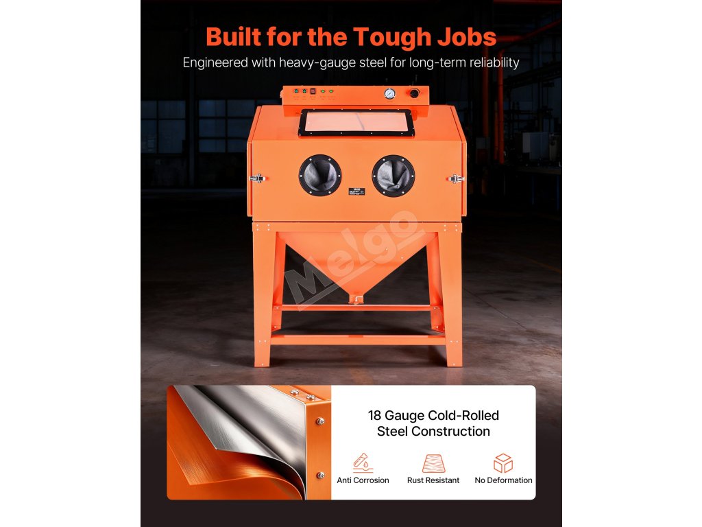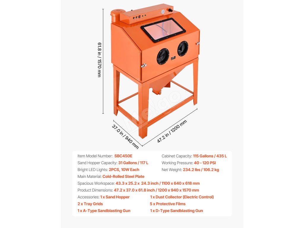 S našou 115-galónovou pieskovacou skriňou si účinne poradíte s odstraňovaním farby a hrdze z rozmerných dielov a dosiahnete vynikajúcu povrchovú úpravu. Jej priestranný interiér s rozmermi 43,3" x 25,2" x 24,3", 31-galónový zásobník na médium a výkonný 1,6-HP zberač prachu poskytujú dostatok priestoru a vysokú účinnosť pri veľkých projektoch.