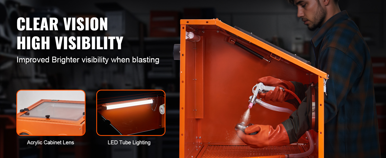 Pre bezproblémovú prevádzku je kľúčová jasná viditeľnosť. Naša prenosná pieskovacia skriňa sa môže pochváliť priehľadným akrylovým pozorovacím oknom a osvetlením LED trubice, ktoré poskytuje dostatočnú a jasnú viditeľnosť na pozorovanie pracovného procesu, čím zabezpečuje plynulejšie a efektívnejšie pieskovanie.