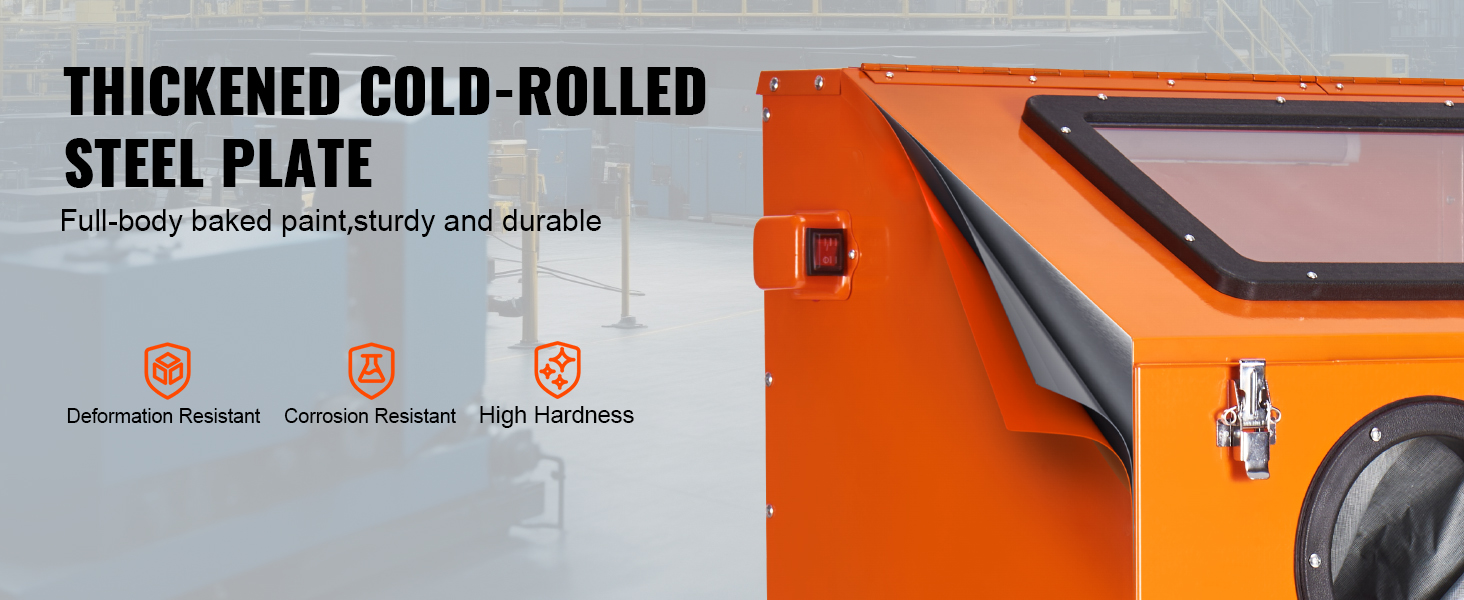 Naša skriňa na vzduchové pieskovanie je vyrobená z odolnej ocele valcovanej za studena a je výnimočne odolná. Jej práškovo lakovaný povrch zvyšuje odolnosť proti korózii a hrdzi, čím zabezpečuje dlhú životnosť a spoľahlivosť pre vaše potreby pri pieskovaní.