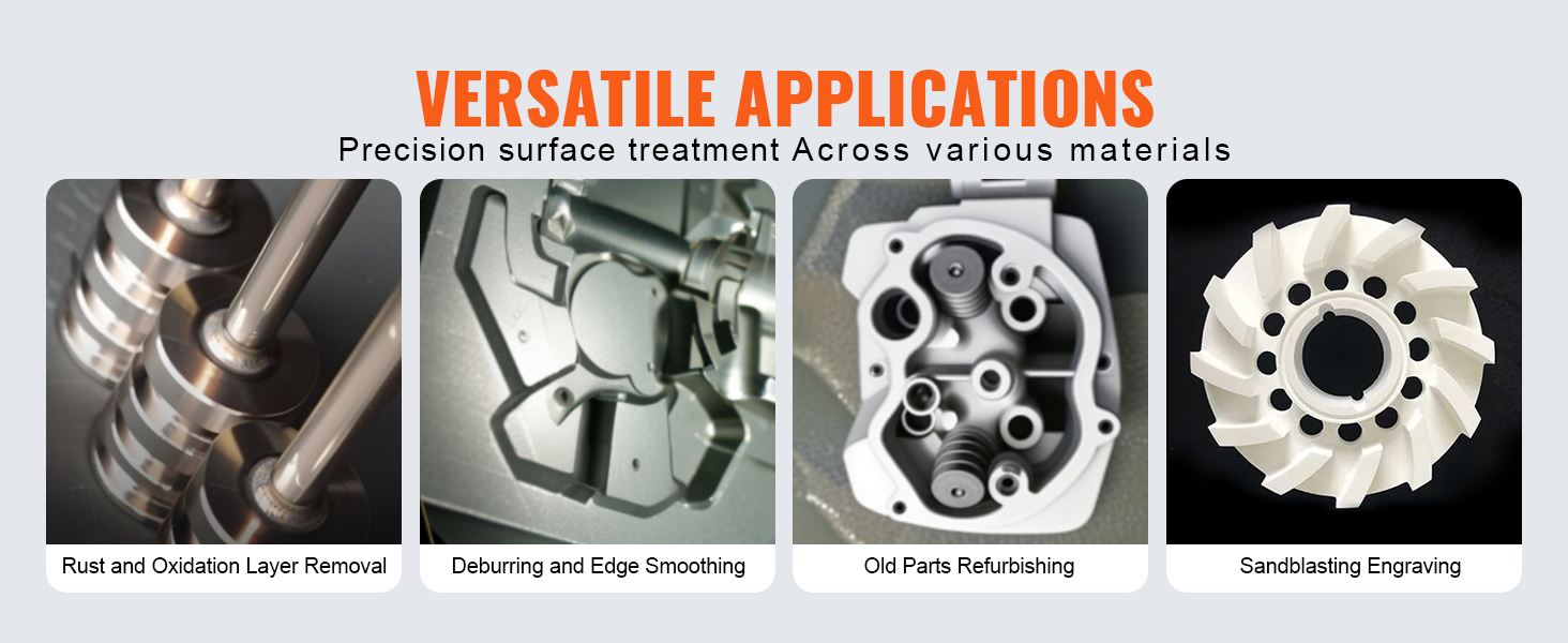 Súprava pieskovača VEVOR je univerzálna na širokú škálu povrchových úprav rôznych materiálov. Od odstraňovania hrdze a oxidačných vrstiev až po odstraňovanie otrepov, vyhladzovanie hrán, renováciu starých dielov a gravírovanie pieskovaním - bez námahy a s presnosťou splní rôznorodé potreby.