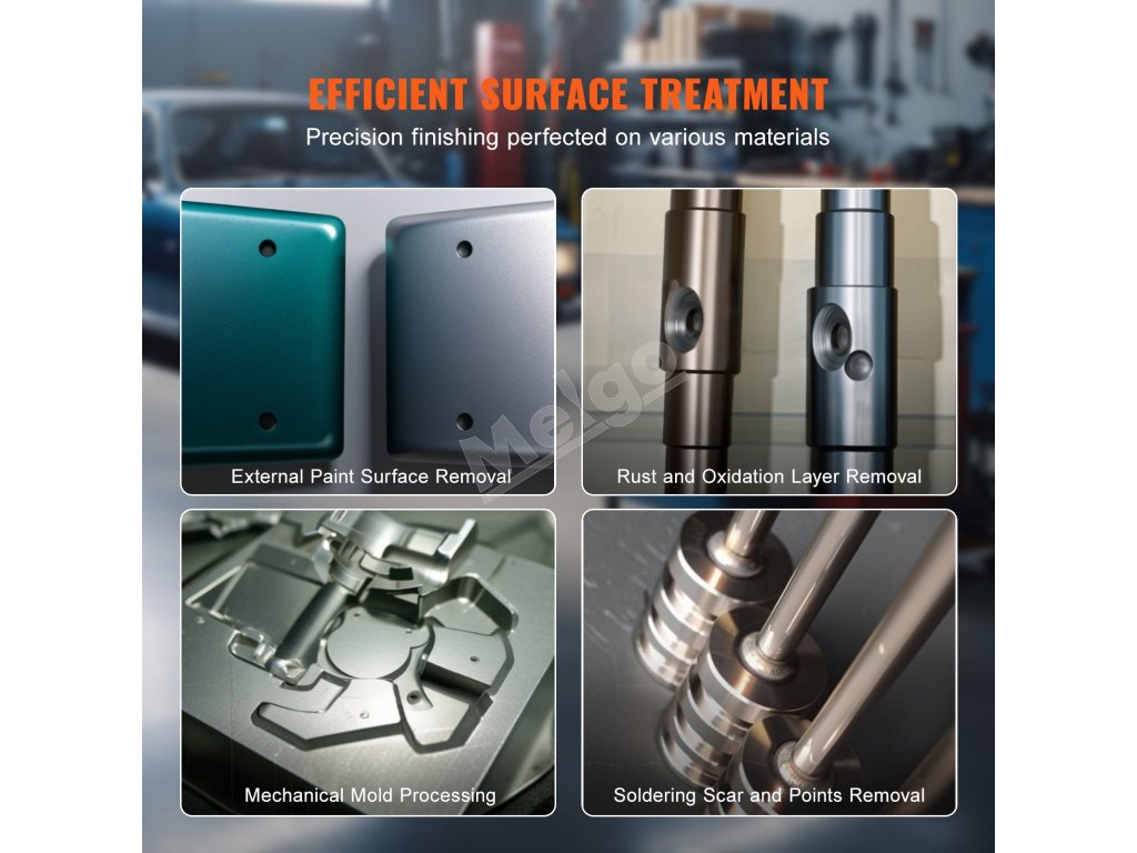 Súprava pieskovača VEVOR je univerzálna na širokú škálu povrchových úprav rôznych materiálov. Od odstraňovania hrdze a oxidačných vrstiev až po odstraňovanie otrepov, vyhladzovanie hrán, renováciu starých dielov a gravírovanie pieskovaním - bez námahy a s presnosťou splní rôznorodé potreby.