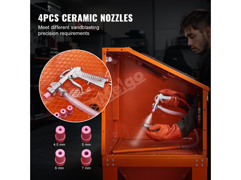 Naša súprava pieskovača je vybavená prvotriednou hliníkovou pieskovacou pištoľou, ponúka odolnosť a presné ovládanie. Súprava obsahuje aj 4 keramické trysky vo veľkostiach 4,5 mm, 5 mm, 6 mm a 7 mm, ktoré v porovnaní s kovovými tryskami ponúkajú vyššiu odolnosť proti opotrebovaniu, korózii a teplu.