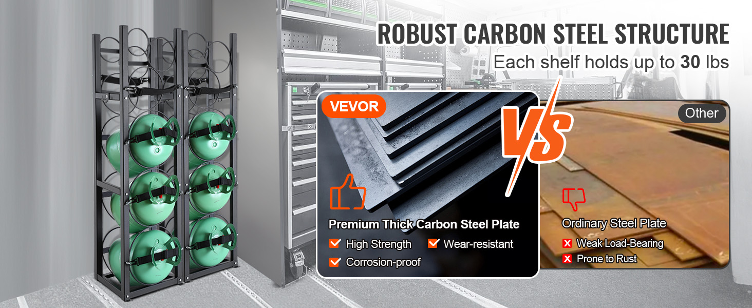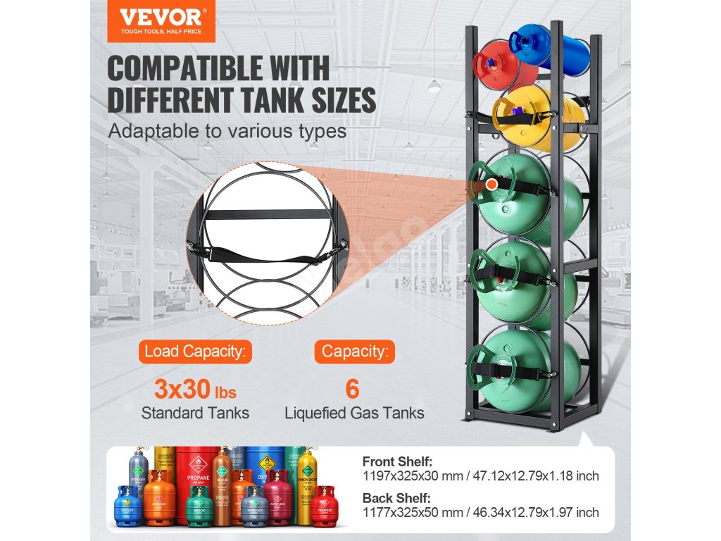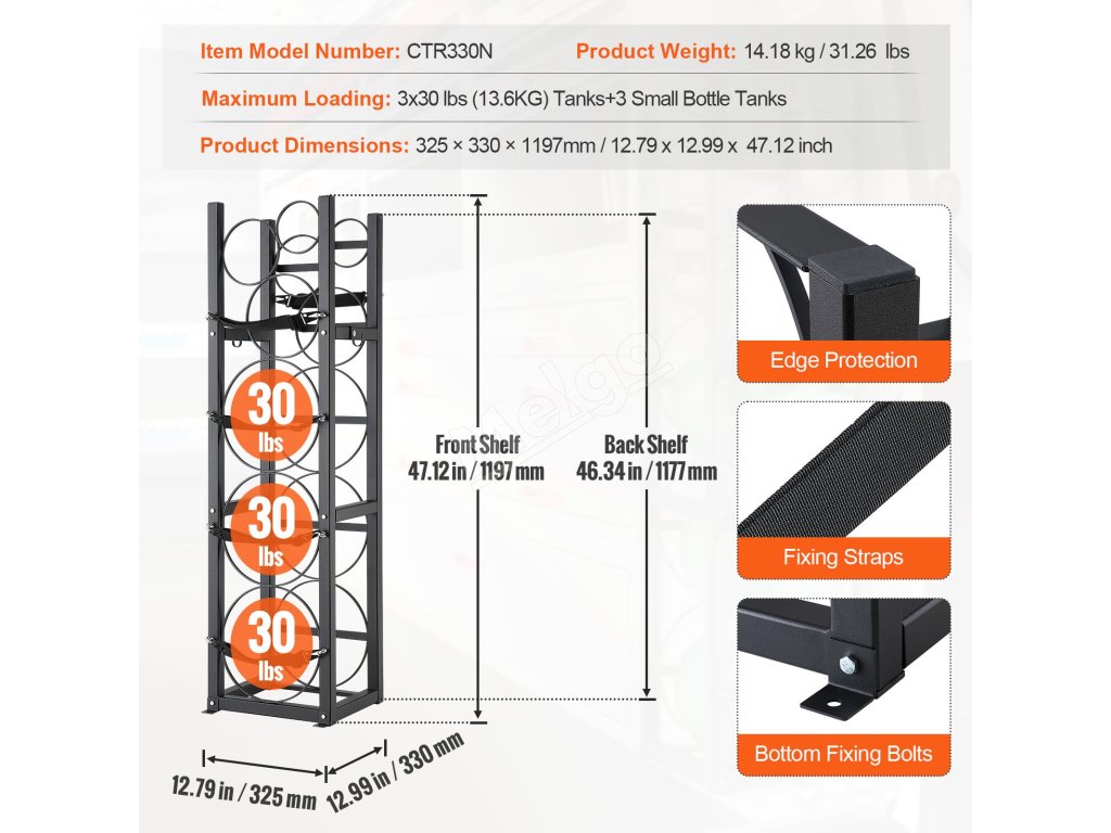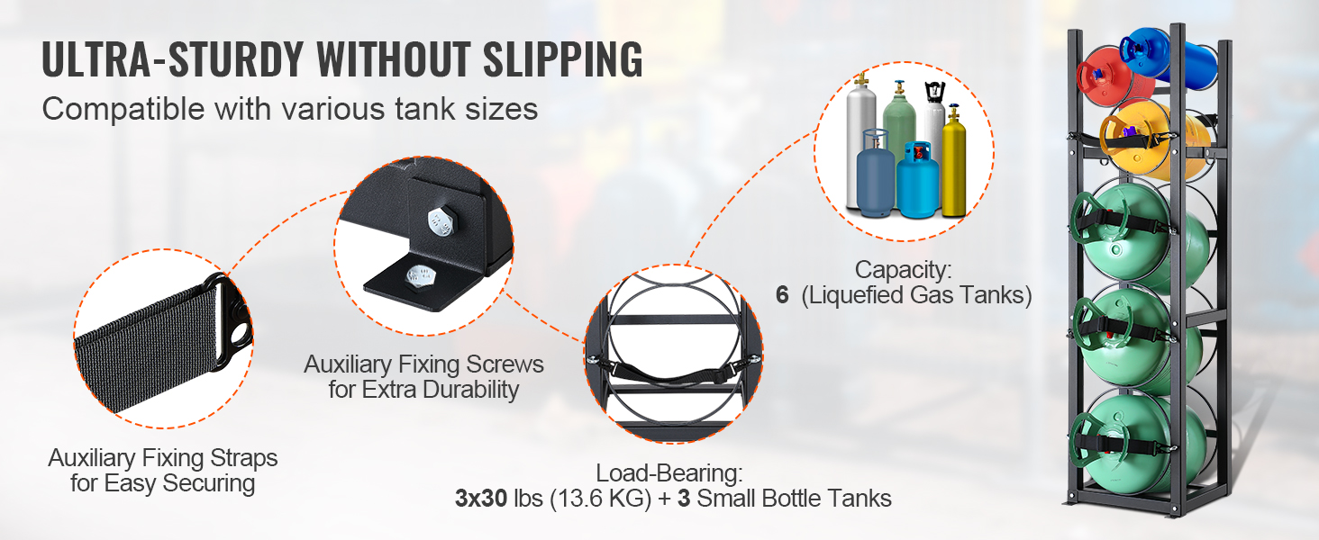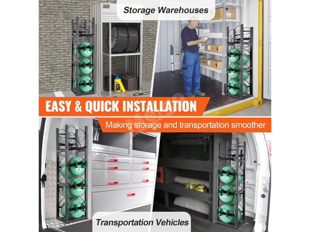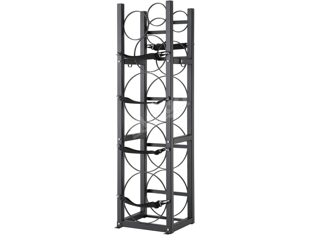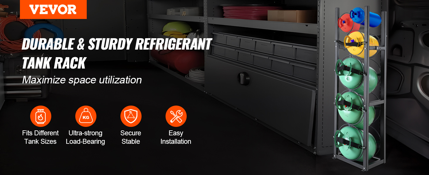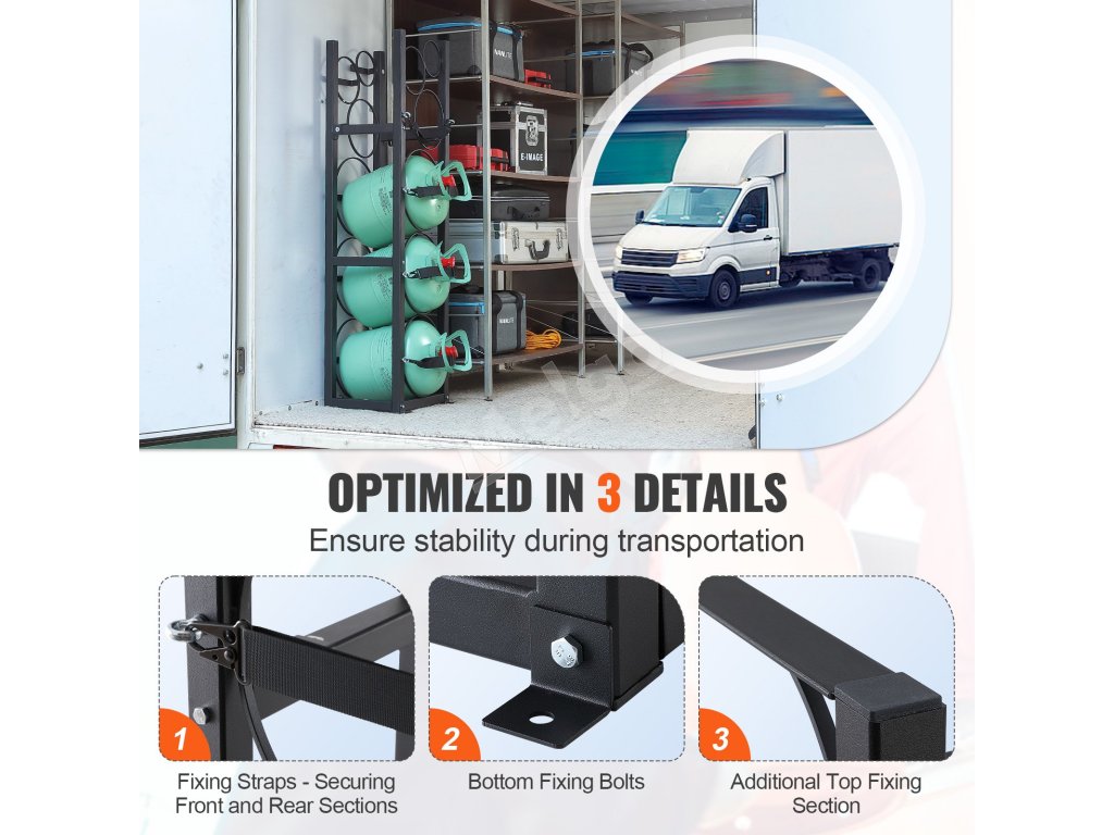 Na zlepšenie stability a kompatibility s rôznymi veľkosťami nádrží je tento stojan na fľaše s chladivom vybavený nastaviteľnými upevňovacími popruhmi a spodnými skrutkami. Pojme 3x30 lbs (13,6 kg) nádrží a ďalšie 3 malé fľaše s nádržami. Bezpečne uložte svoje nádrže a zároveň maximalizujte využitie priestoru.