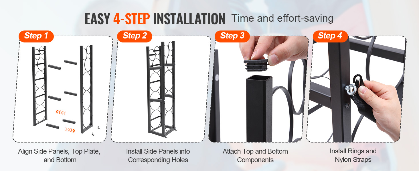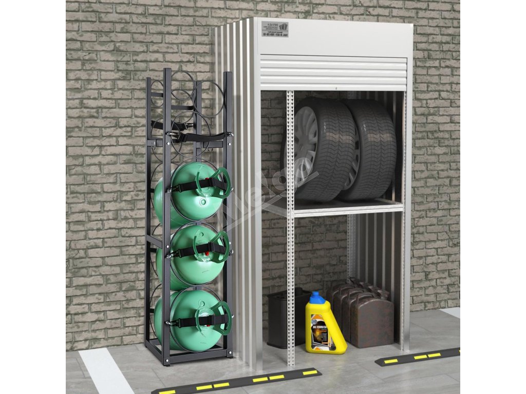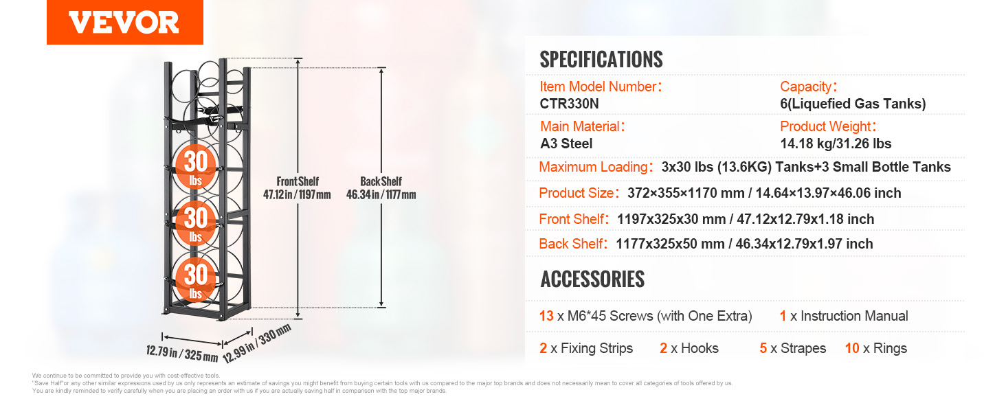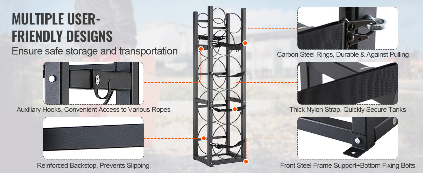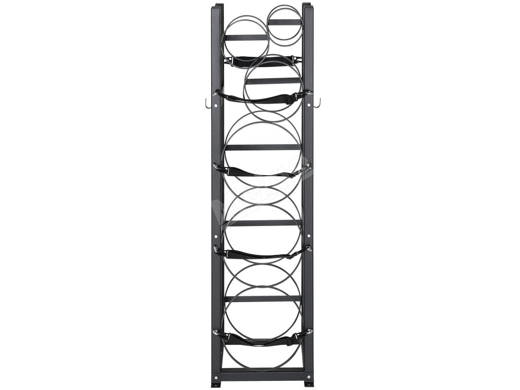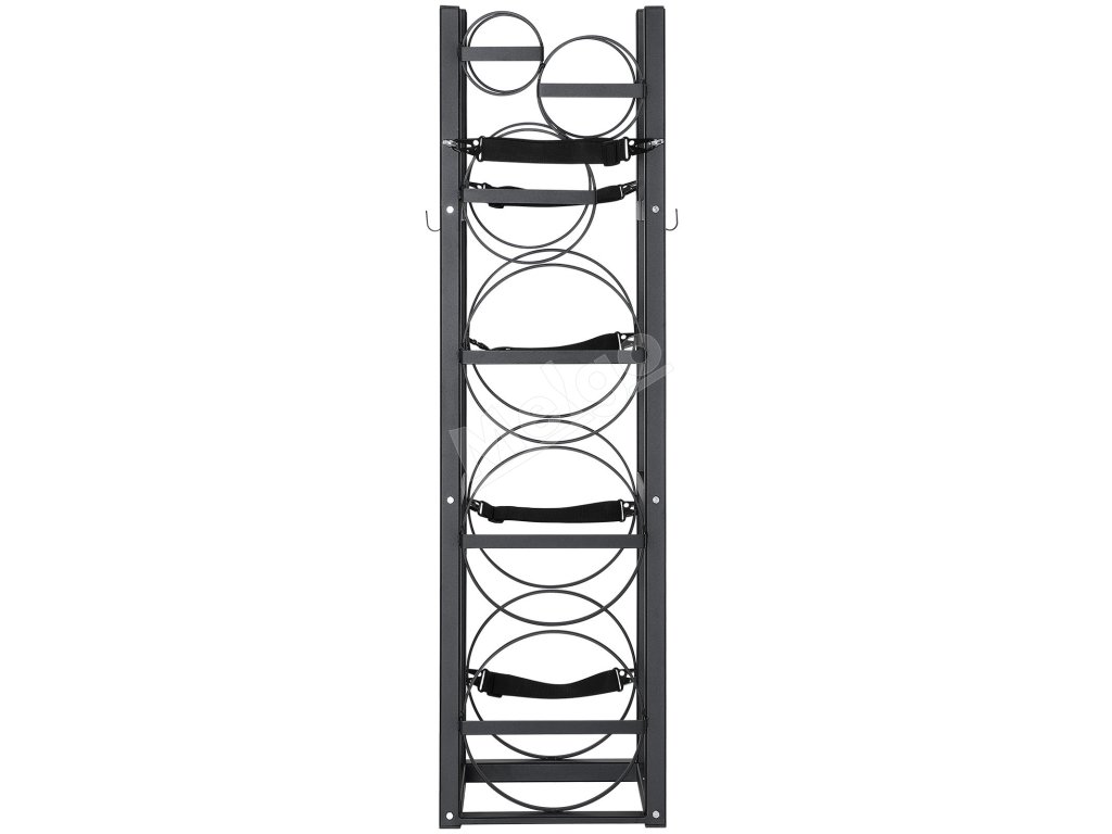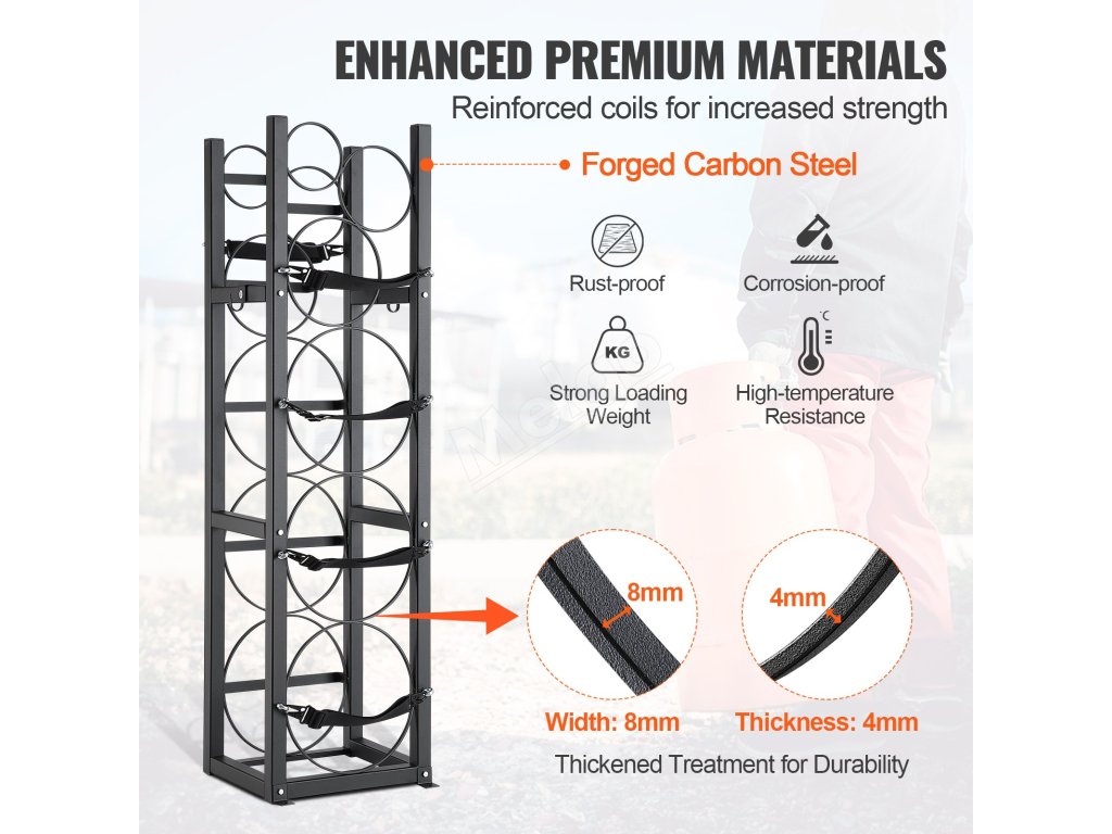 Na zlepšenie stability a kompatibility s rôznymi veľkosťami nádrží je tento stojan na fľaše s chladivom vybavený nastaviteľnými upevňovacími popruhmi a spodnými skrutkami. Pojme 3x30 lbs (13,6 kg) nádrží a ďalšie 3 malé fľaše s nádržami. Bezpečne uložte svoje nádrže a zároveň maximalizujte využitie priestoru.