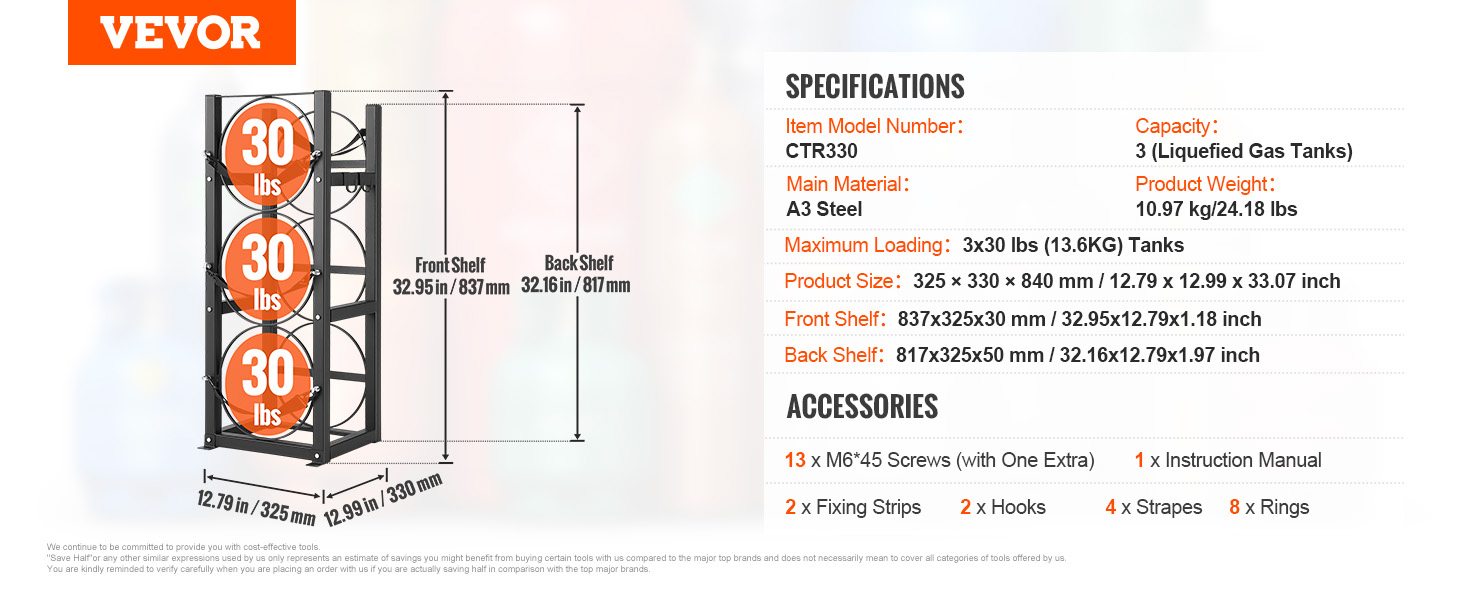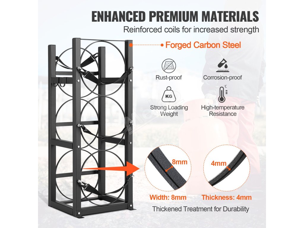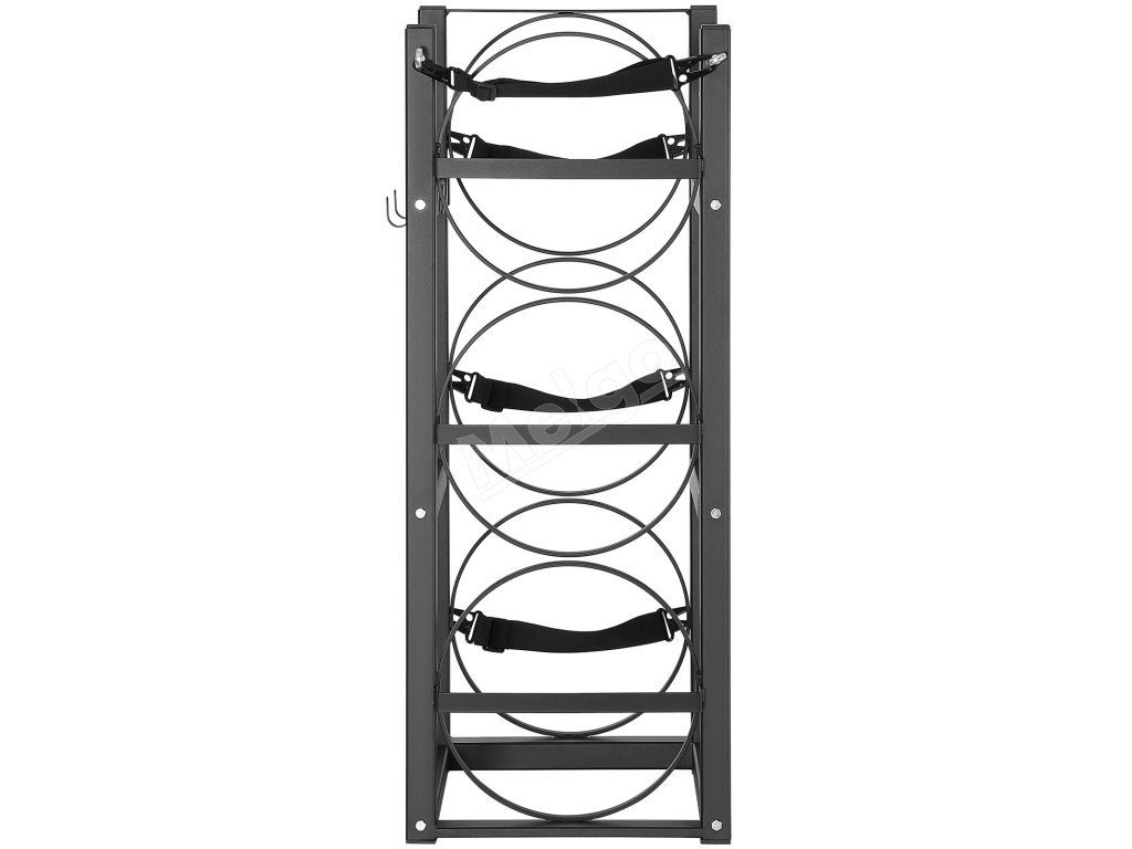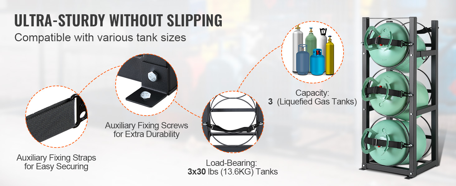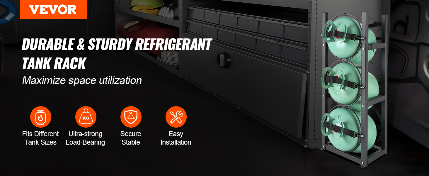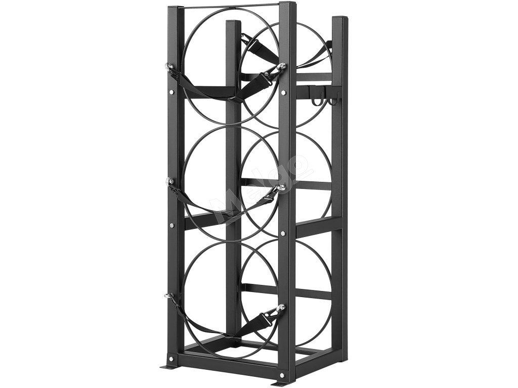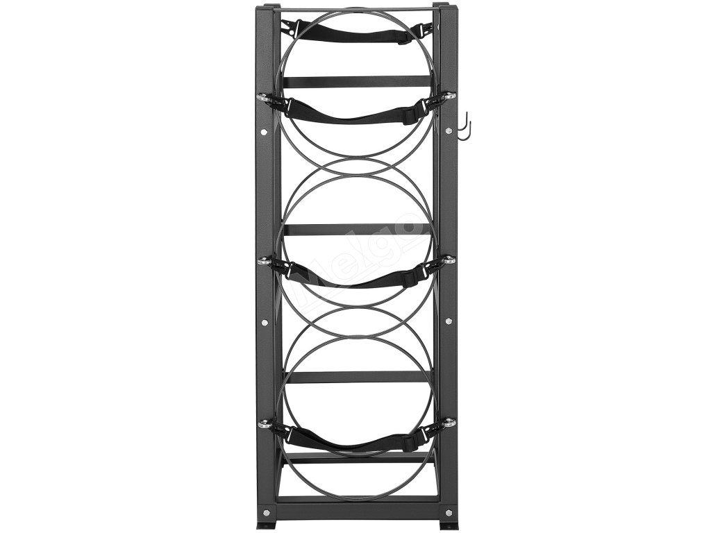 Na zlepšenie stability a kompatibility s rôznymi veľkosťami nádrží je tento stojan na fľaše s chladivom vybavený nastaviteľnými upevňovacími popruhmi a spodnými skrutkami. Pojme nádrže s hmotnosťou 2x30 lbs (13,6 kg) a ďalšie 3 malé fľaše s nádržami. Bezpečne uložte svoje nádrže a zároveň maximalizujte využitie priestoru.