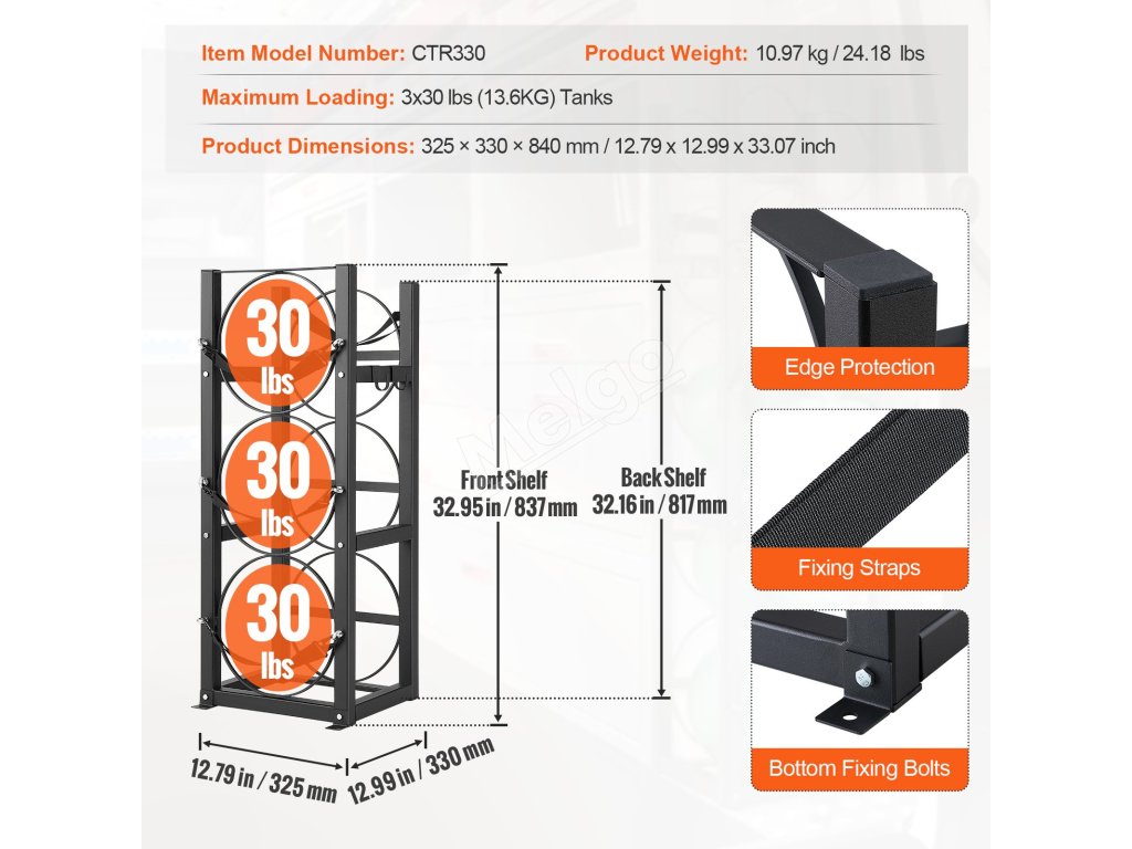 Tento trojposchodový stojan na nádrže s chladivom má rozmery 325x330x840 mm/12,79x12,99x33,07 palca. Je vyrobený z odolnej uhlíkovej ocele a môže sa pochváliť silnou nosnosťou. Vďaka jednoduchej inštalácii s kompletným príslušenstvom je ideálny pre sklady s nádržami alebo vozidlá.