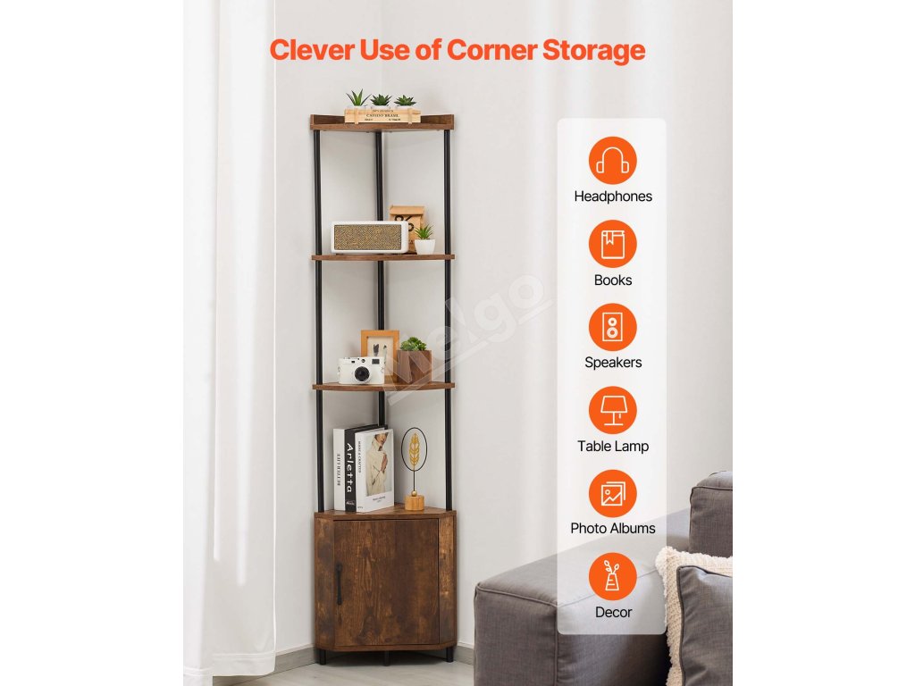 Rohová polica 5-policová s led a dvierkami, kovový rám, drevené police