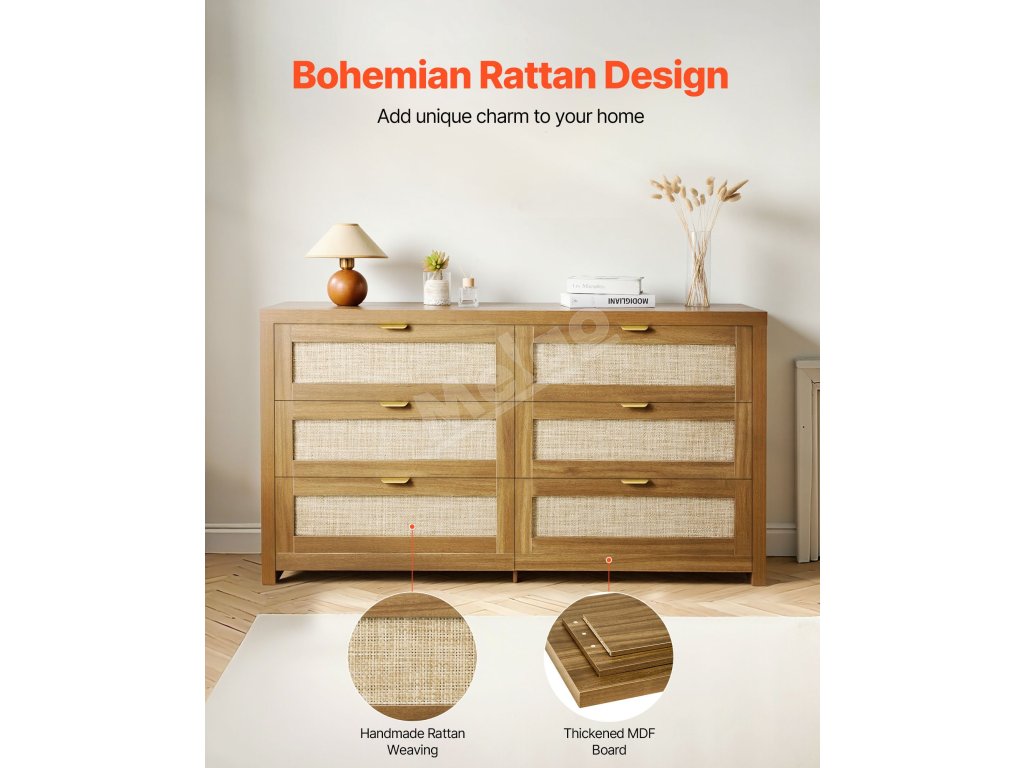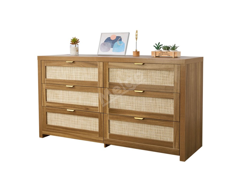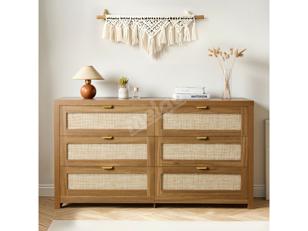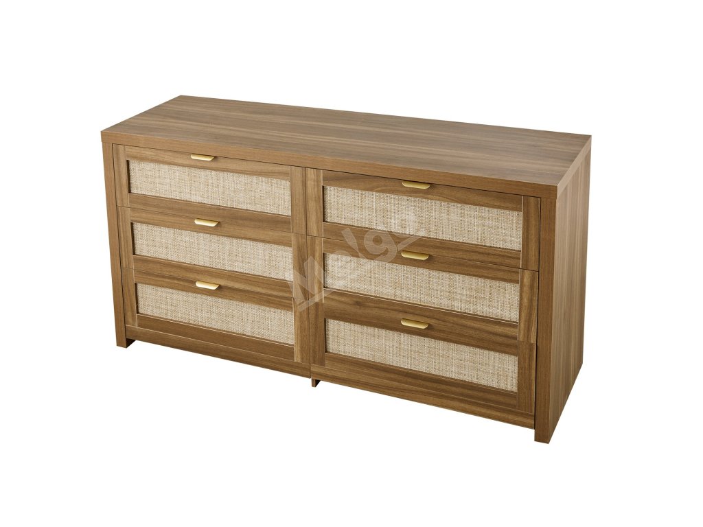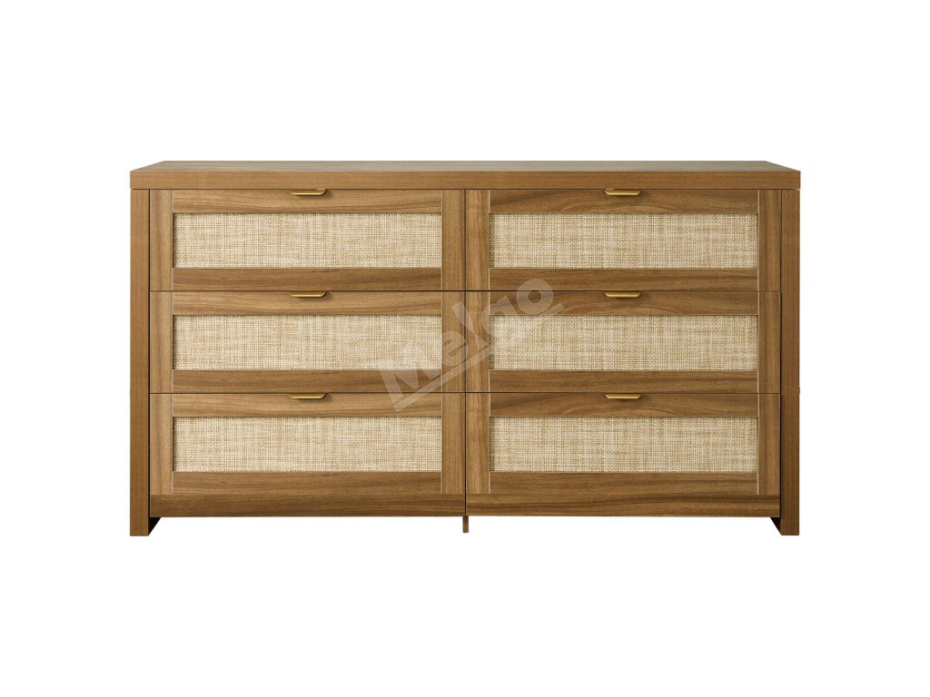 Komoda s 6 zásuvkami z prírodného ratanu, kovové úchyty, orech