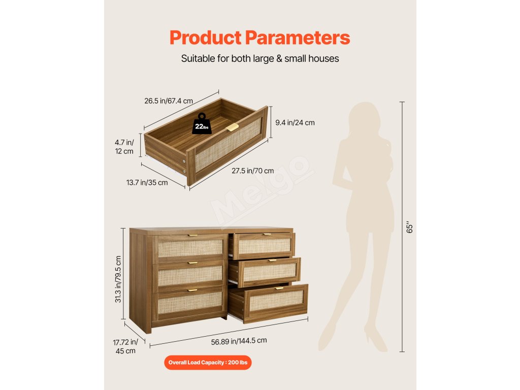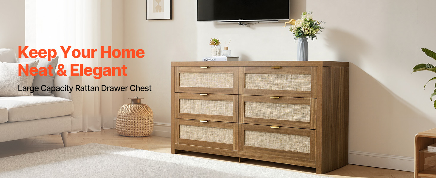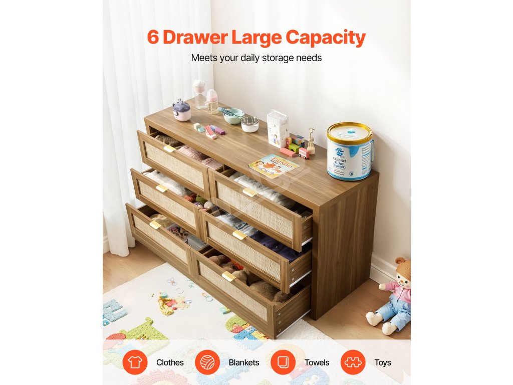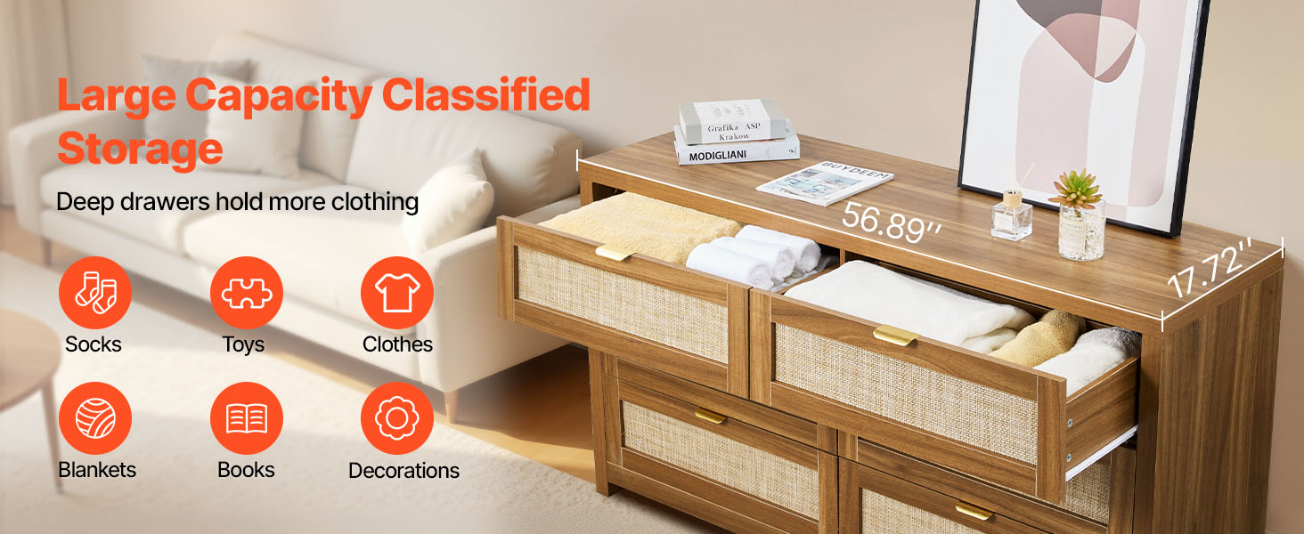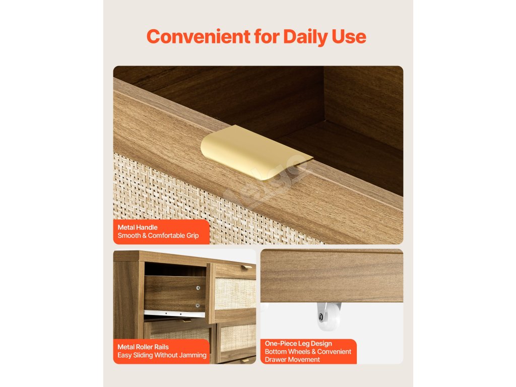 Naša priestranná ratanová komoda poskytuje viacvrstvový úložný priestor. Vďaka hlbším a širším zásuvkám v nej možno utriedene uložiť veľké množstvo oblečenia a vecí dennej potreby. Na hornú plochu sa dajú uložiť dekorácie alebo často používané predmety, čo spĺňa rozmanité potreby organizácie domácnosti.
