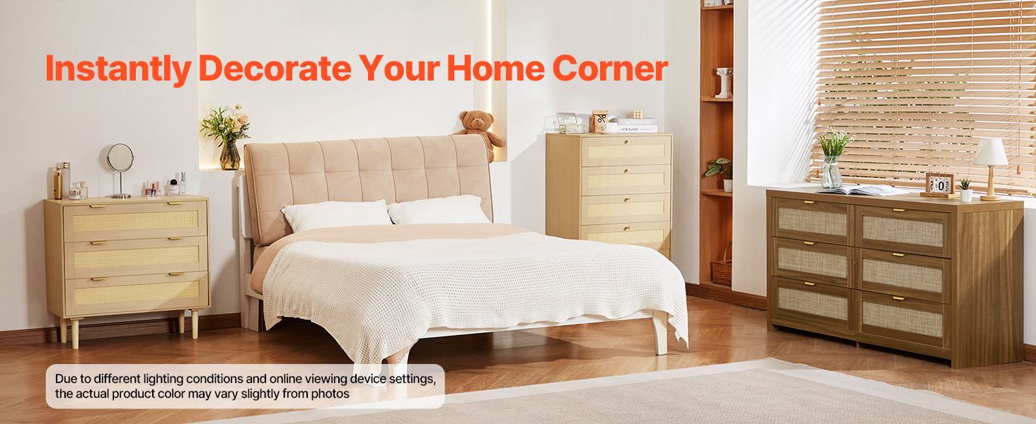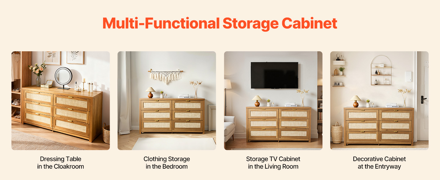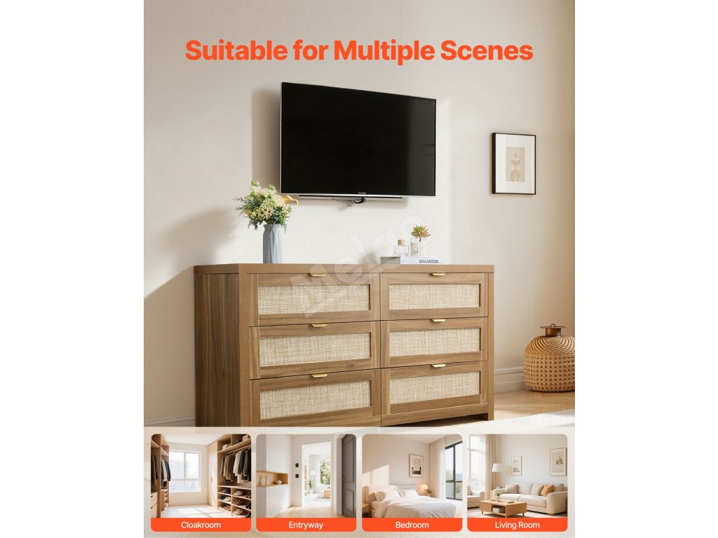 Táto prútená komoda do spálne vám poskytuje skvelé riešenie úložného priestoru. Možno ju použiť ako televíznu skrinku, úložnú skrinku, vchodovú skrinku atď. vhodnú na rôzne príležitosti. Je to úložná skrinka aj dekoratívna skrinka.