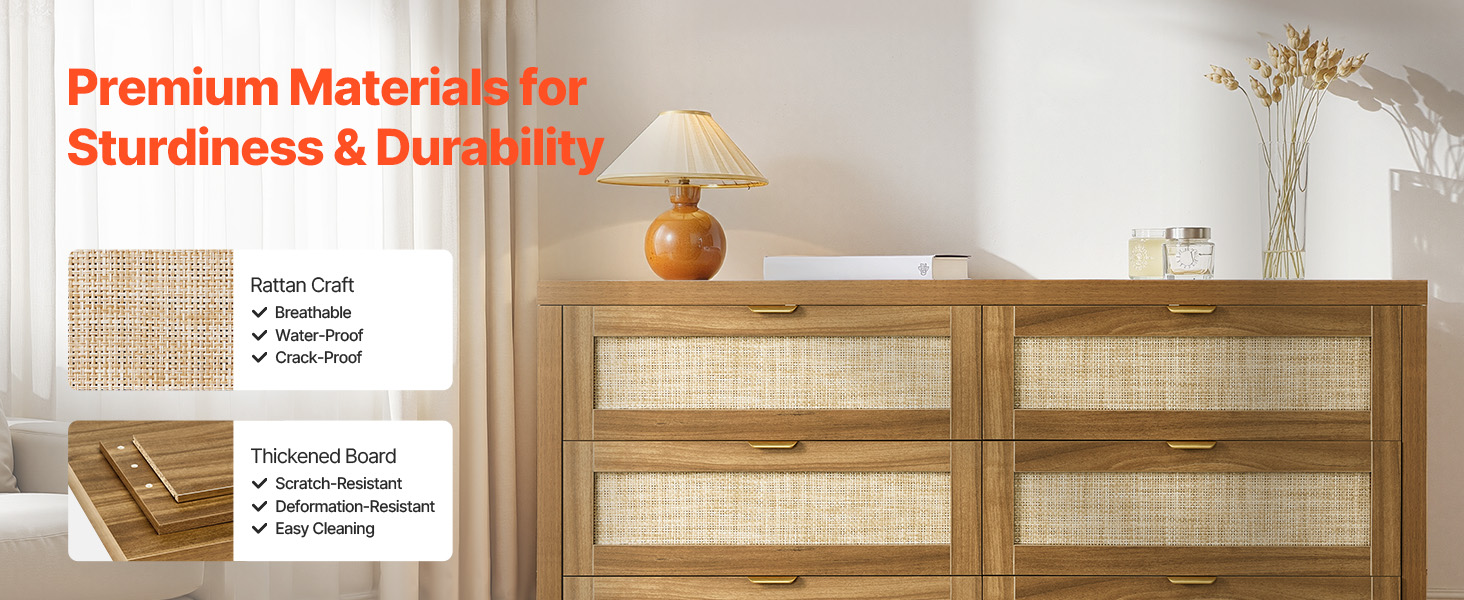 Vďaka ratanovej konštrukcii, ktorá podporuje prúdenie vzduchu, znižuje ratanová komoda vlhkosť v interiéri a udržiava predmety suché. Jej hrubé dosky podopierajú plne naložené zásuvky bez deformácie alebo poškodenia.
