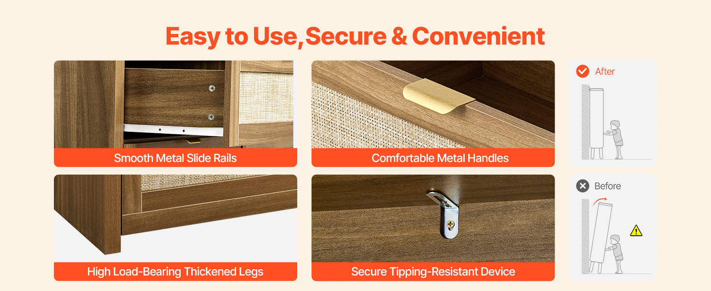 Naša boho komoda sa dodáva s kovovými úchytkami, ktoré poskytujú pohodlné uchopenie, v spojení s posuvnými lištami, ktoré zostávajú hladké pri tlačení a ťahaní. Jej vysoko nosné nohy a zariadenie proti prevráteniu zabezpečujú spoľahlivé používanie, odolávajú opotrebovaniu pri každodennom používaní, vďaka čomu bude dlho vyzerať ako nová.