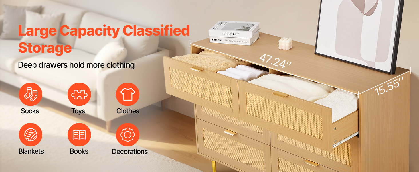 Naša priestranná ratanová komoda poskytuje viacvrstvový úložný priestor. Vďaka hlbším a širším zásuvkám v nej možno utriedene uložiť veľké množstvo oblečenia a vecí dennej potreby. Na hornú plochu sa dajú uložiť dekorácie alebo často používané predmety, čo spĺňa rozmanité potreby organizácie domácnosti.