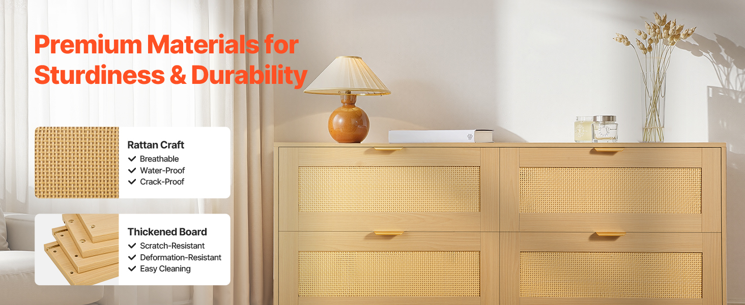 Vďaka ratanovej konštrukcii, ktorá podporuje prúdenie vzduchu, znižuje ratanová komoda vlhkosť v interiéri a udržiava predmety suché. Jej hrubé dosky podopierajú plne naložené zásuvky bez deformácie alebo poškodenia.