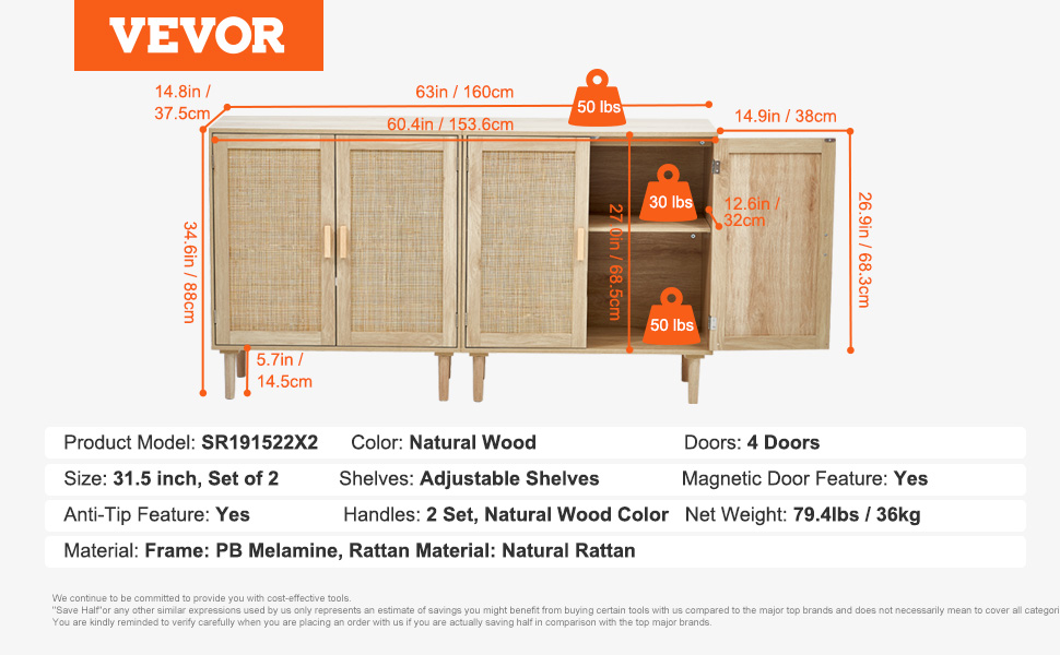Naša bufetová skrinka je navrhnutá s vynikajúcou nosnosťou, pričom horná polica unesie až 50 libier (22,7 kg), vnútorné police unesú 30 libier (13,6 kg) a spodná polica 50 libier (22,7 kg).